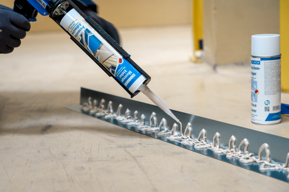 Adhesivo de curado rápido y resistente a base de caucho sintético para pegado en interiores y exteriores. El adhesivo de montaje elástico es monocomponente, se puede utilizar en muchos materiales, como madera y tableros de fibra de madera, tableros MDF y OSB, tableros decorativos, acero, aluminio, plástico, PVC, yeso, cartón yeso, cerámica, mampostería, azulejos, piedra y hormigón. El adhesivo es adecuado para la fijación rápida y permanente de rodapiés, paneles, elementos de suelos, revestimientos de paredes, fondos de ventanas, umbrales de puertas, marcos de puertas de madera, perfiles decorativos y muchas otras aplicaciones.