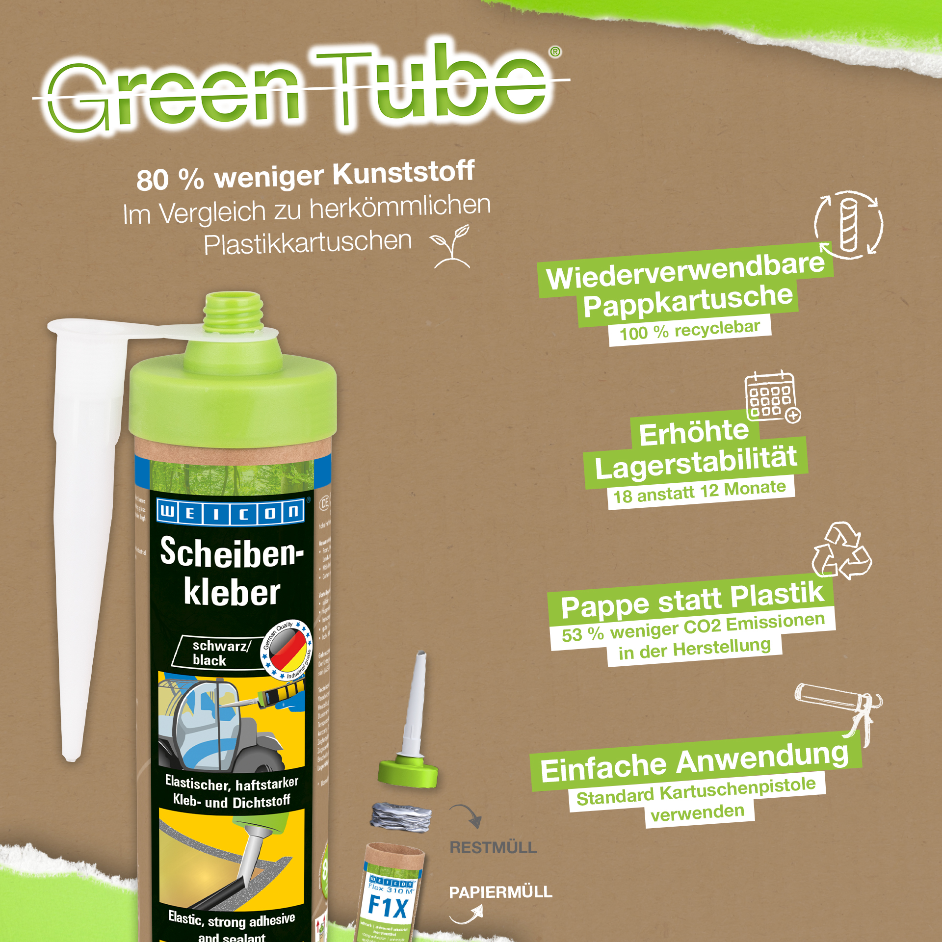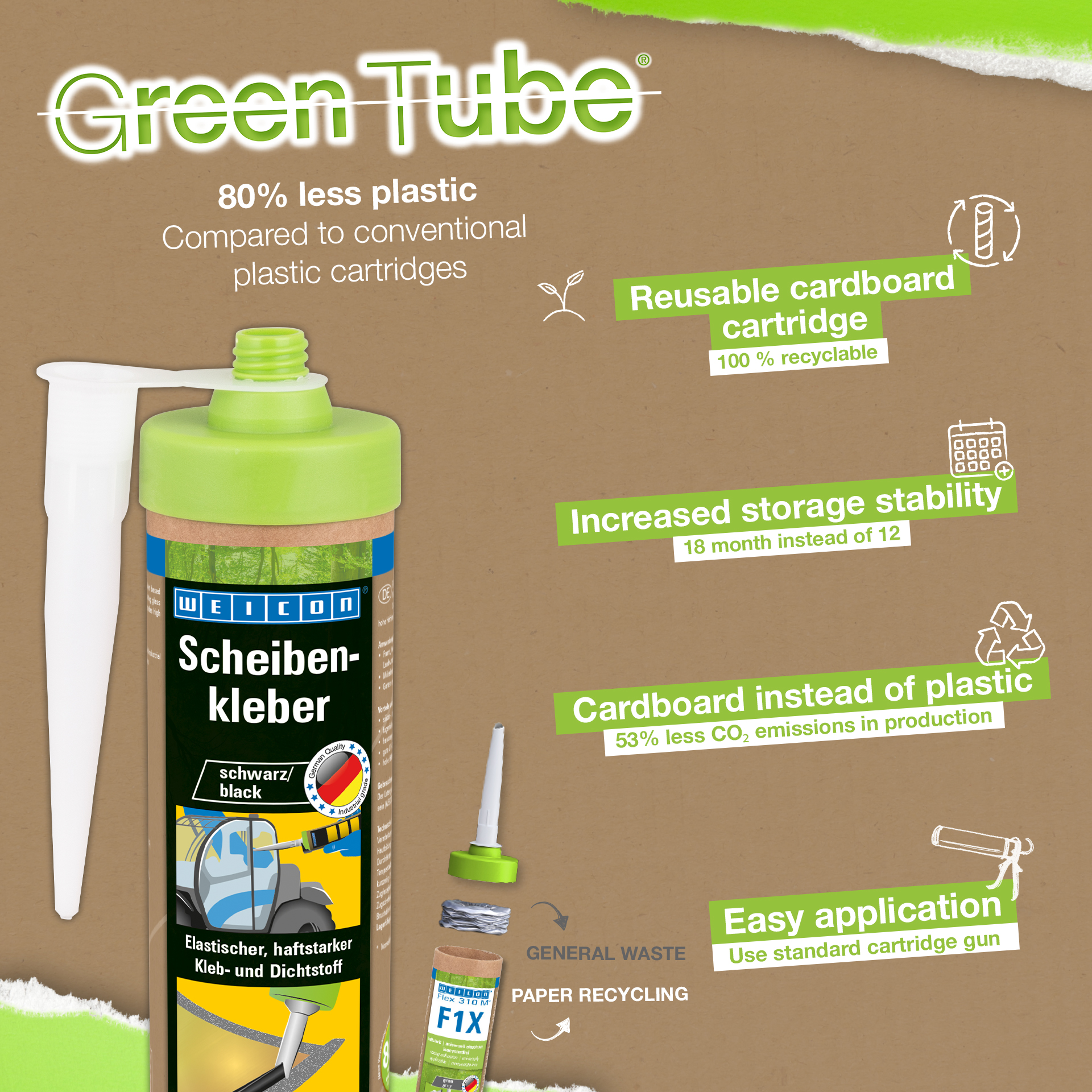 WEICON Adhesivo para Cristales es un adhesivo y sellador elástico de 1 componente en base a polímero MS, que fue desarrollado especialmente para el ensamblaje de cristales y vidrios. Por ejemplo, se puede utilizar el adhesivo para instalar ventanas frontales, traseras y laterales en camiones industriales, maquinaria agrícola y de construcción. También es adecuado para la fabricación de muebles o para el montaje en jardinería y paisajismo. El Adhesivo para Cristales tiene una gran fuerza adhesiva en muchas superficies y endurece con la humedad del aire. Tiene una excelente resistencia al envejecimiento y buena estabilidad UV. Es apto para el relleno de fugas, inodoro y libre de siliconas, isocianatos, halógenos y diluyentes.