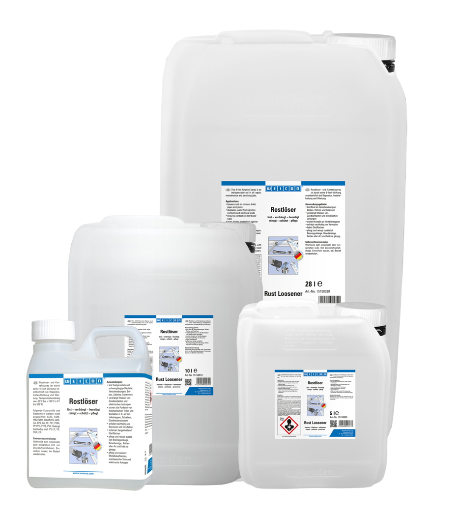 Gracias a sus seis funciones, el Lubricante Aflojatodo es indispensable en cualquier reparación y en todos los trabajos de mantenimiento. Gracias a sus excelentes propiedades de penetración, el Aflojatodo entra incluso en los intersticios más pequeños. Afloja componentes, uniones atornilladas, pernos, articulaciones y bisagras bloqueados por el óxido y de difícil acceso, protege duraderamente contra corrosión y oxidación. El Aflojatodo WEICON lubrica duraderamente superficies de deslizamiento, conserva y limpia superficies metálicas, piezas mecánicas e instalaciones eléctricas.