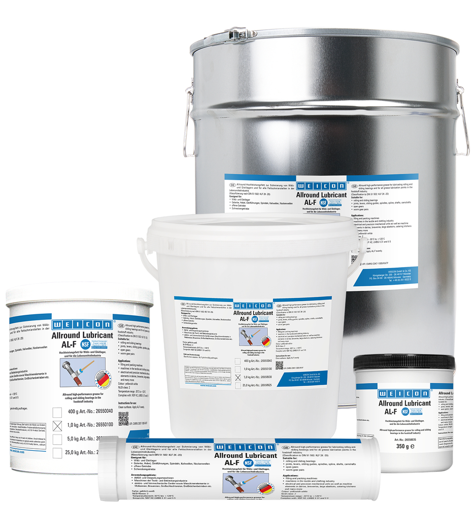 WEICON AL-F puede utilizarse para lubricar cojinetes de rodillos y de deslizamiento, articulaciones, palancas, guías de deslizamiento, husillos, ejes estriados, árboles de levas, engranajes abiertos, engranajes helicoidales y todos los puntos de lubricación con grasa. Gracias a su homologación NSF H2, la grasa es apta para su uso en la industria alimentaria.