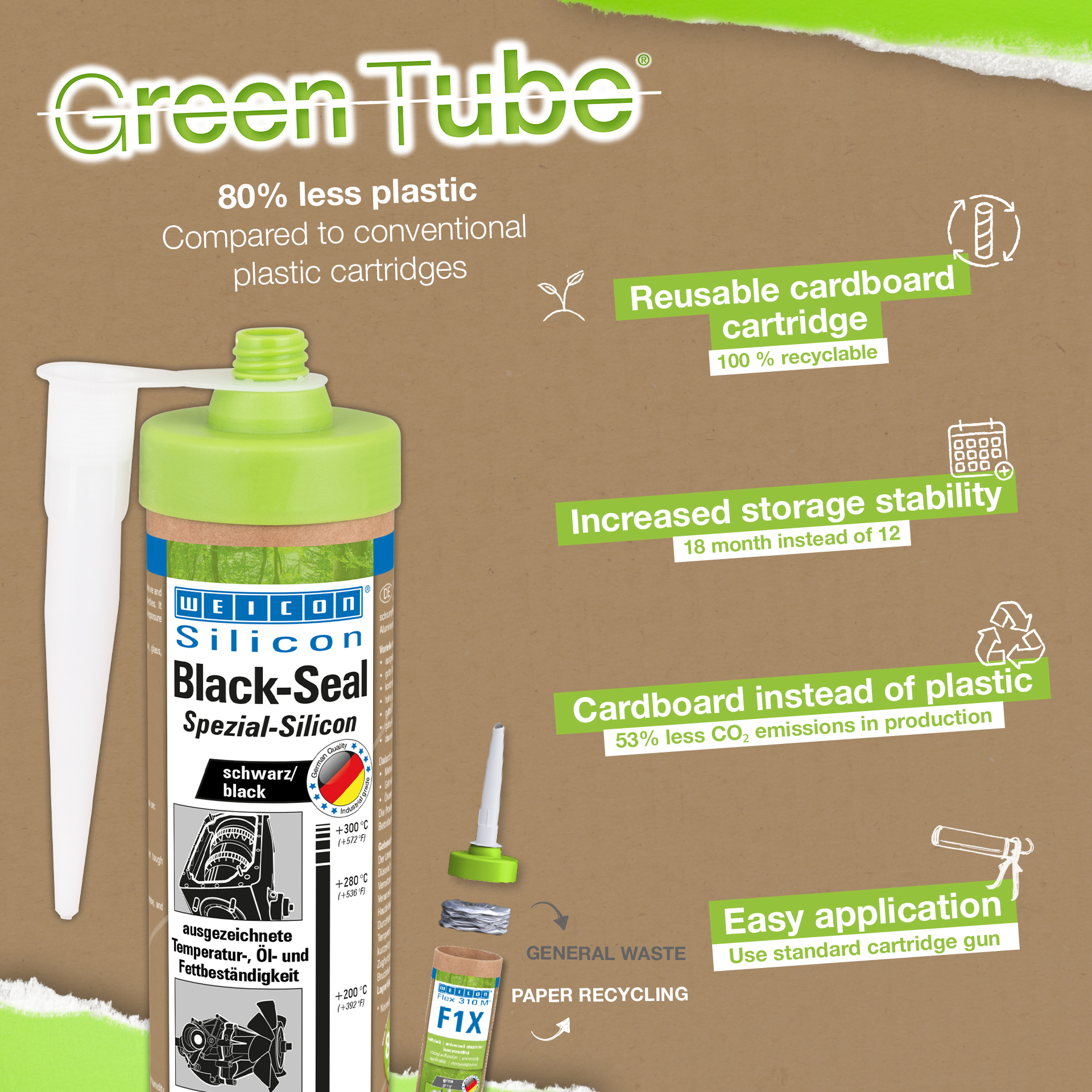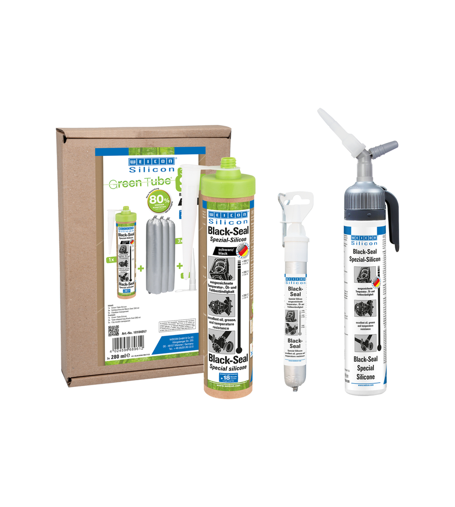 WEICON Black-Seal es resistente a altas temperaturas (+280 °C/+536 °F), exento de diluyentes, de gran adherencia, resistente a la presión, al envejecimiento y extremamente elástico (alargamiento a la rotura de aprox. 500%). Adecuado para pegar y sellar piezas que requieren una resistencia especialmente alta a los aceites y grasas. El producto puede aplicarse en las tapas de transmisiones, válvulas y carcasas, cárteres de aceite y bombas de aceite, bombas de agua, transmisiones, ejes, bridas, tanques, recipientes y numerosos otros campos.