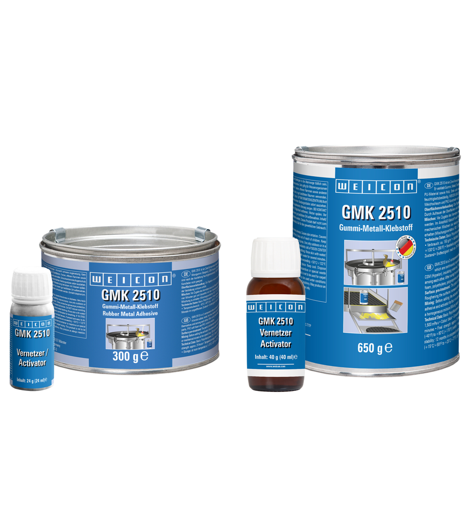 GMK 2510 es un adhesivo bicomponente a base de policloropropreno usado para pegar grandes superficies con permanente elasticidad sometidas constantemente a cargas dinámicas. La ventaja respecto a los adhesivos monocomponentes de contacto es la adherencia evidentemente mayor y la mejor resistencia a la temperatura. GMK 2510 se utiliza para pegar goma, metal, textiles, cuero, goma musgosa (neopreno), CSM (hipalón), materiales aislantes, material PU con revestimiento adherente así como madera y numerosos plásticos. Después del endurecimiento del adhesivo, las uniones quedan resistentes a la humedad. WEICON GMK 2510 no es apto para materiales tales como la espuma de poliestireno, polietileno, piezas de polipropileno, plástico celular plastificado de PVC y cuero artificial de PVC.