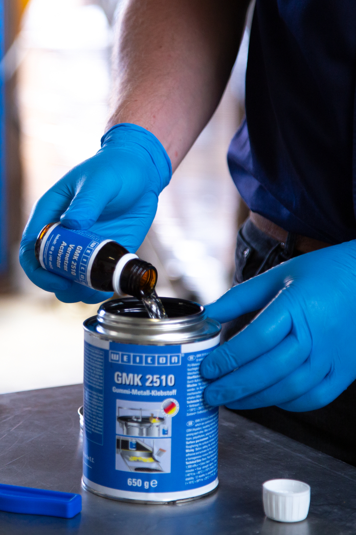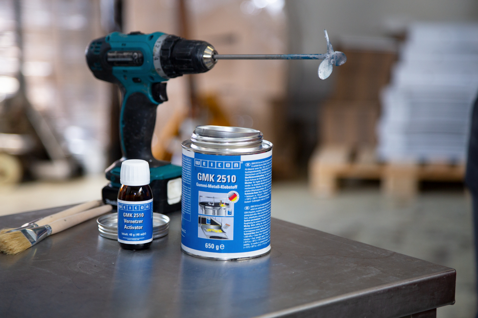 GMK 2510 es un adhesivo bicomponente a base de policloropropreno usado para pegar grandes superficies con permanente elasticidad sometidas constantemente a cargas dinámicas. La ventaja respecto a los adhesivos monocomponentes de contacto es la adherencia evidentemente mayor y la mejor resistencia a la temperatura. GMK 2510 se utiliza para pegar goma, metal, textiles, cuero, goma musgosa (neopreno), CSM (hipalón), materiales aislantes, material PU con revestimiento adherente así como madera y numerosos plásticos. Después del endurecimiento del adhesivo, las uniones quedan resistentes a la humedad. WEICON GMK 2510 no es apto para materiales tales como la espuma de poliestireno, polietileno, piezas de polipropileno, plástico celular plastificado de PVC y cuero artificial de PVC.