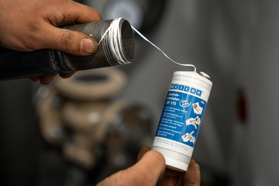 WEICON DF 175 es un hilo sellador de roscas patentado, fabricado 100% en PTFE, que sella casi todas las roscas de metal y de plástico de forma permanente y segura. WEICON DF 175 rellena de forma fiable el espacio intermedio en las roscas y crea una película de PTFE con el espesor necesario durante el procedimiento de atornillado. Esta película es extremadamente resistente a casi todos los productos químicos, incluso a los disolventes, agentes cáusticos y ácidos más agresivos. WEICON DF 175 no es inflamable y funciona de forma fiable en un rango de temperaturas de -200 °C (-328 °F) a +240 °C (+464 °F). A diferencia de otros materiales de sellado, en los que el tejido actúa únicamente como base para el sellador, WEICON DF 175 es en sí mismo el material de sellado. De este modo se evita que el material base y el material de sellado se separen durante la vida útil de la unión atornillada. WEICON DF 175 es duradero por tiempo ilimitado y se mantiene permanentemente blando y elástico. WEICON DF 175 es muy económico: Una unidad sustituye hasta 20 rollos de cinta PTFE (12 mm x 0,1 mm x 12 m).