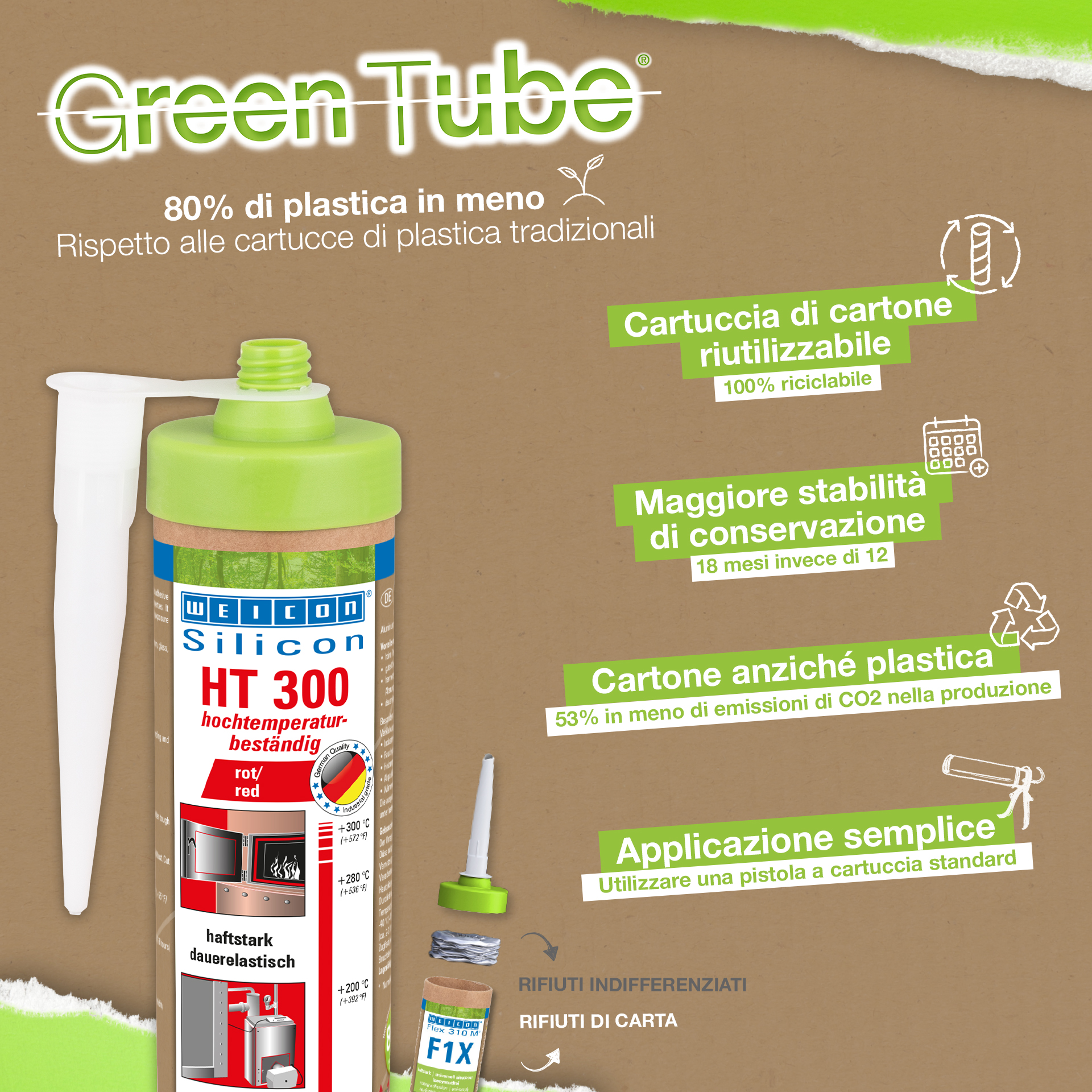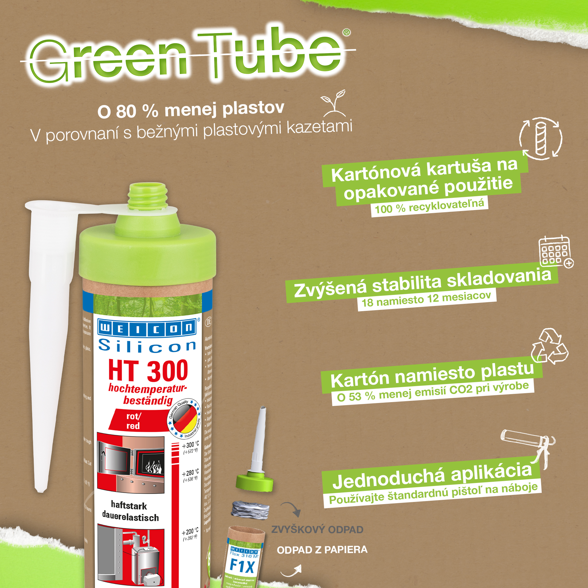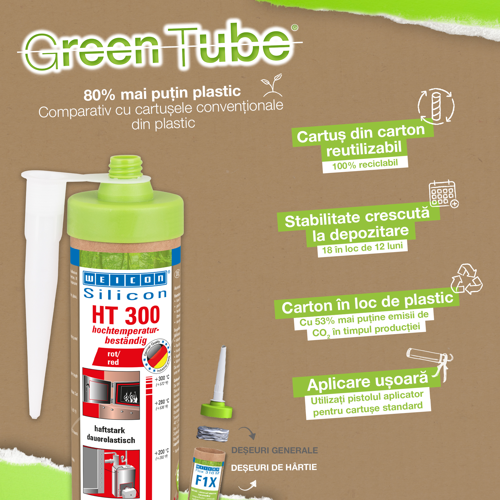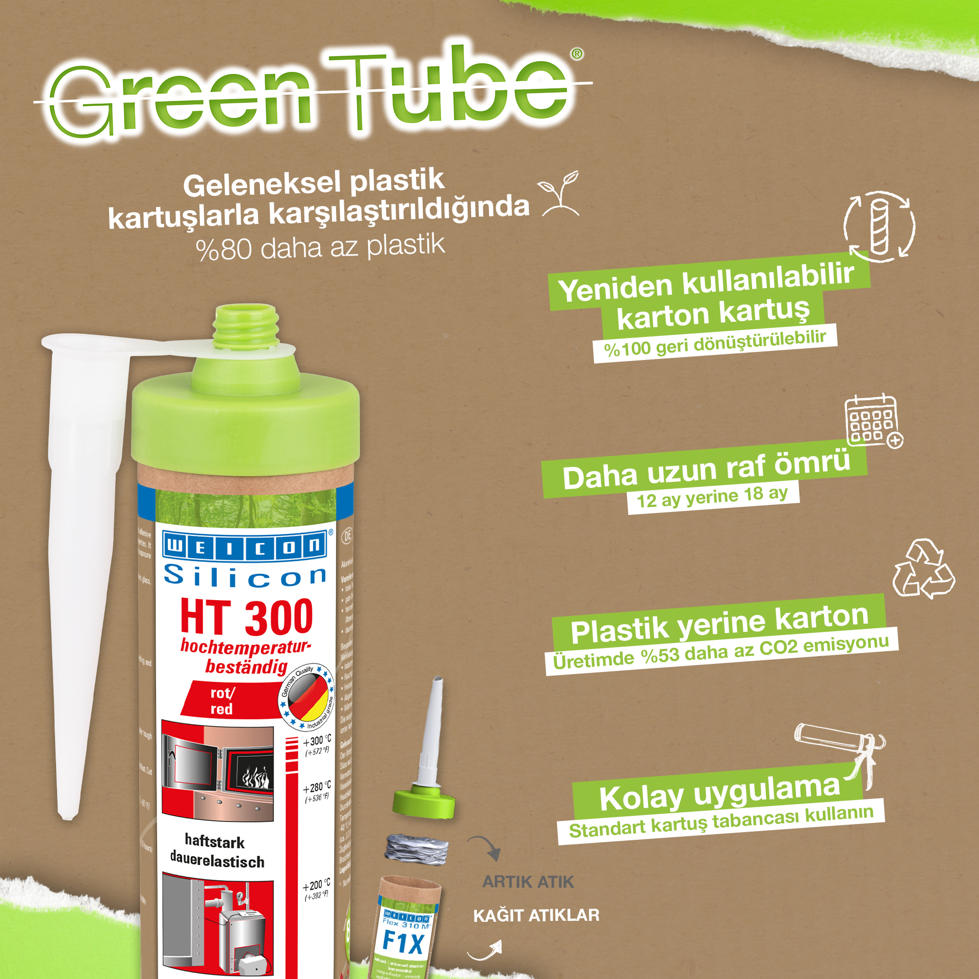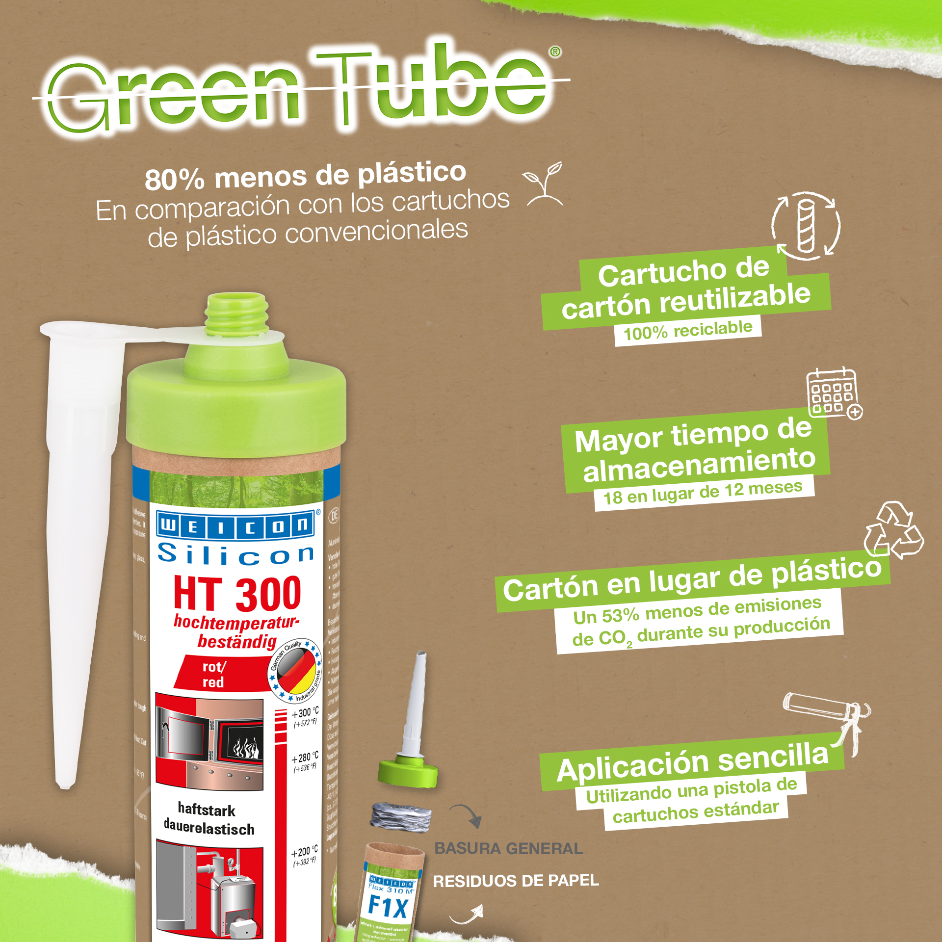 WEICON HT 300 es resistente a altas temperaturas (+300 °C/+572 °F), exento de diluyentes, de gran adherencia, con reticulante de acetato, resistente a la intemperie, al envejecimiento y a productos químicos y extremamente elástico (alargamiento a la rotura de aprox. 300%). El producto es apto especialmente para uniones y sellados sometidos a gran calor y ofrece una excelente adherencia al acero, aluminio, vidrio, cerámica y a numerosos otros materiales. Este adhesivo y sellador puede aplicarse en hornos industriales, en instalaciones de gas de humo, instalaciones de calefacción, conductos de gases de escape, armarios térmicos y en una gran cantidad de otros campos.