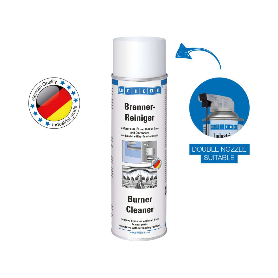 El Limpiador de Quemadores WEICON es un limpiador especial para eliminar grasa, aceite, hollín y otras suciedades en las piezas de quemadores. El limpiador se evapora sin dejar residuo alguno. El Limpiador de Quemadores puede aplicarse en soportes de boquillas y discos perforados de medida, en ventiladores, en rotores de ventiladores y en carcasas interiores, electrodos de encendido, etc.