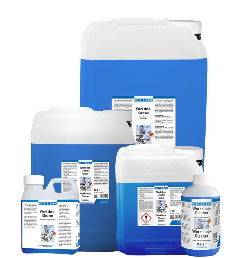 El Limpiador de talleres WEICON limpia y desengrasa todos los metales, plásticos, gomas, vidrio, cerámica y madera. Remueve eficazmente la grasa, aceite, resina, hollín, cera, nicotina, suciedad de insectos, betún y salpicaduras de alquitrán. El Limpiador de Talleres es exento de diluyentes, emulgatores y fosfatos, es compatible con separadores de aceite (ÖNORM B 5105) y biodegradable según las directrices de la CE. El limpiador es de alta concentración y puede diluirse en agua a una relación de 1:40 (máx.). Contiene agentes tensioactivos seleccionados poco espumosos y, fuera de la limpieza manual, puede aplicarse también en máquinas limpiadoras de alta presión, máquinas lavadoras de piezas y en equipos rociadores (por ejemplo, el Pulverizador WPS 1500).