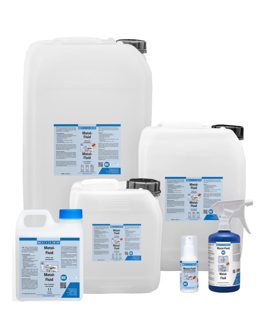 WEICON Metal-Fluid es un agente para proteger y limpiar superficies mates y pulidas en interiores y tiene el certificado NSF. Metal-Fluid protege, conserva y limpia tanto superficies metálicas como también cerámica, madera, vidrio y plásticos. Las inscripciones grabadas al ácido y las impresas así como las superficies de plástico y las juntas de goma no se despegan con Metal-Fluid.