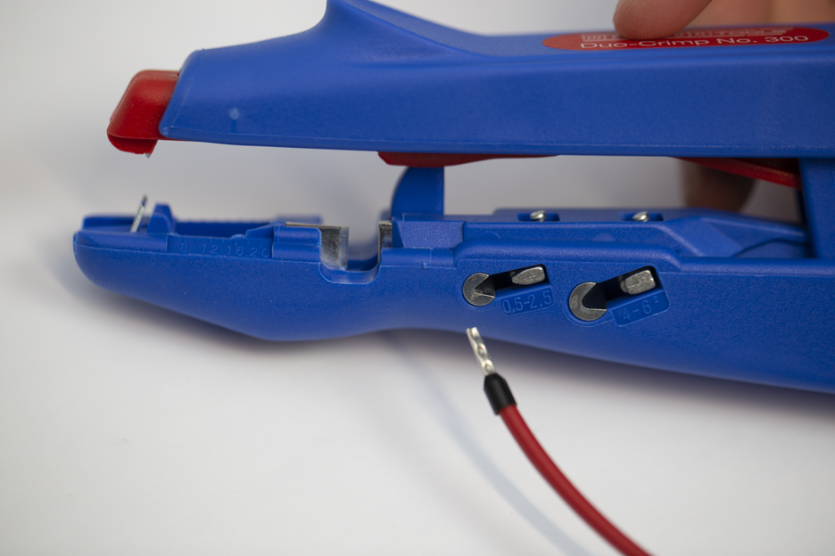 Desaislado rápido y sencillo de 0,5 mm² a 6,0 mm² Dos rangos de presión para el engaste (0,5 - 2,5 mm2 y 4,0 - 6,0 mm2)según DIN 46228-2 Cuchilla lateral integrada y fácilmente accesible hasta 6 mm²