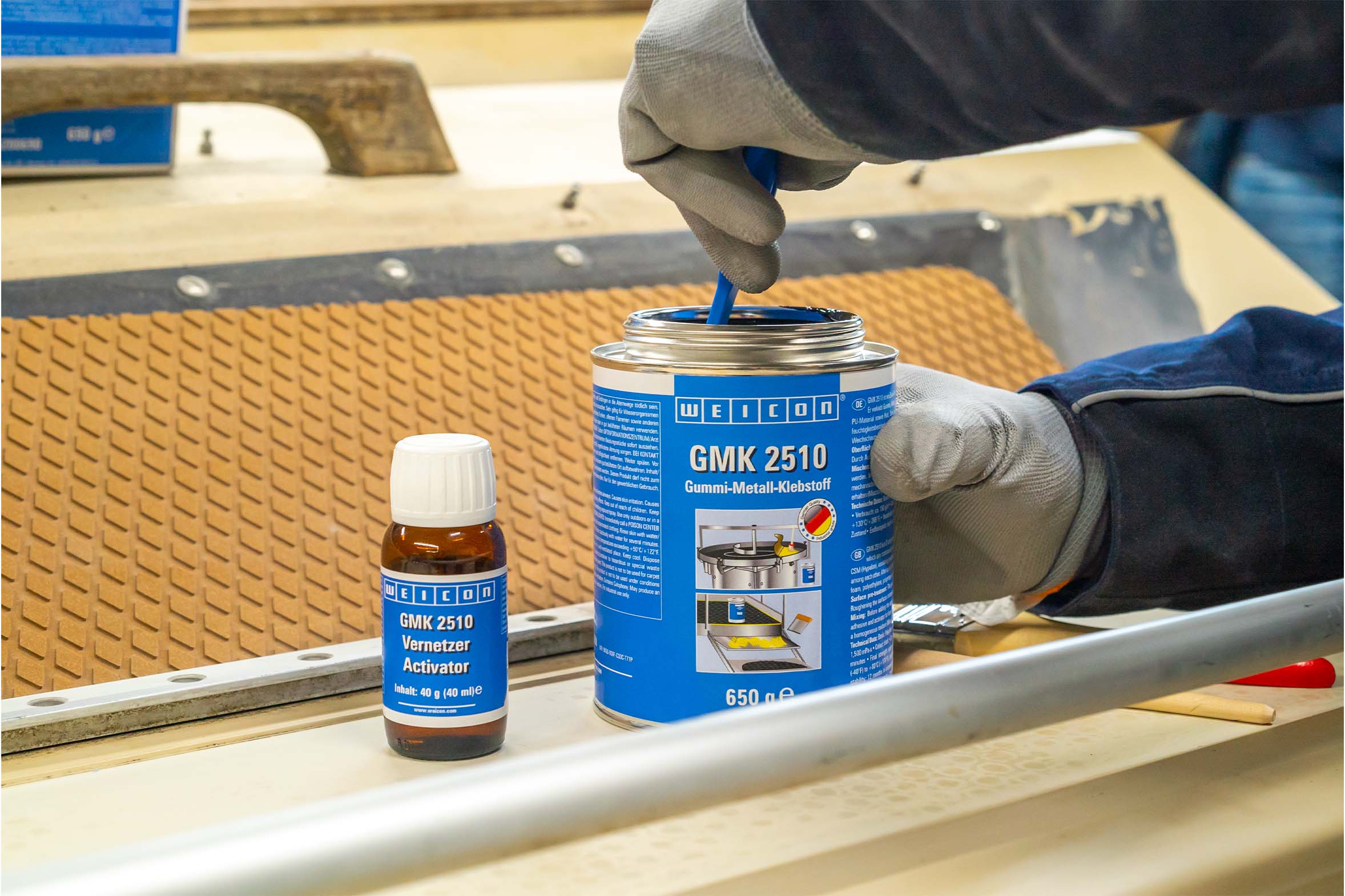 For particularly demanding applications, WEICON GMK 2510 offers even higher final strength and resistance. It is primarily used where a durable and high-strength bond is required, for example when repairing damaged rubber coatings on screw conveyors, fixing rubber pads to metal structures on agricultural machinery or bonding wear protection linings in mixing plants for animal feed.