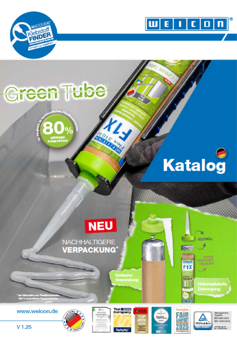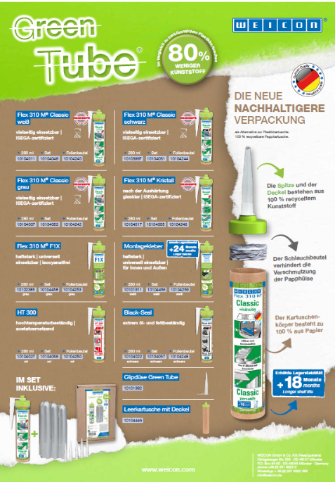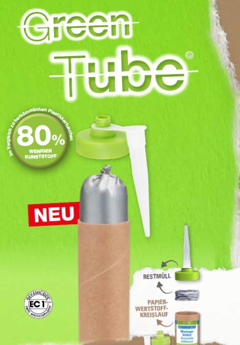 In the production of the Green Tube cartridge, 80% less plastic is used compared to conventional cartridges. The cartridge casing is made from 100% hardened cardboard. The production generates 53% less CO₂ emissions than the manufacturing of a PE cartridge – a clear benefit for the climate and the environment.