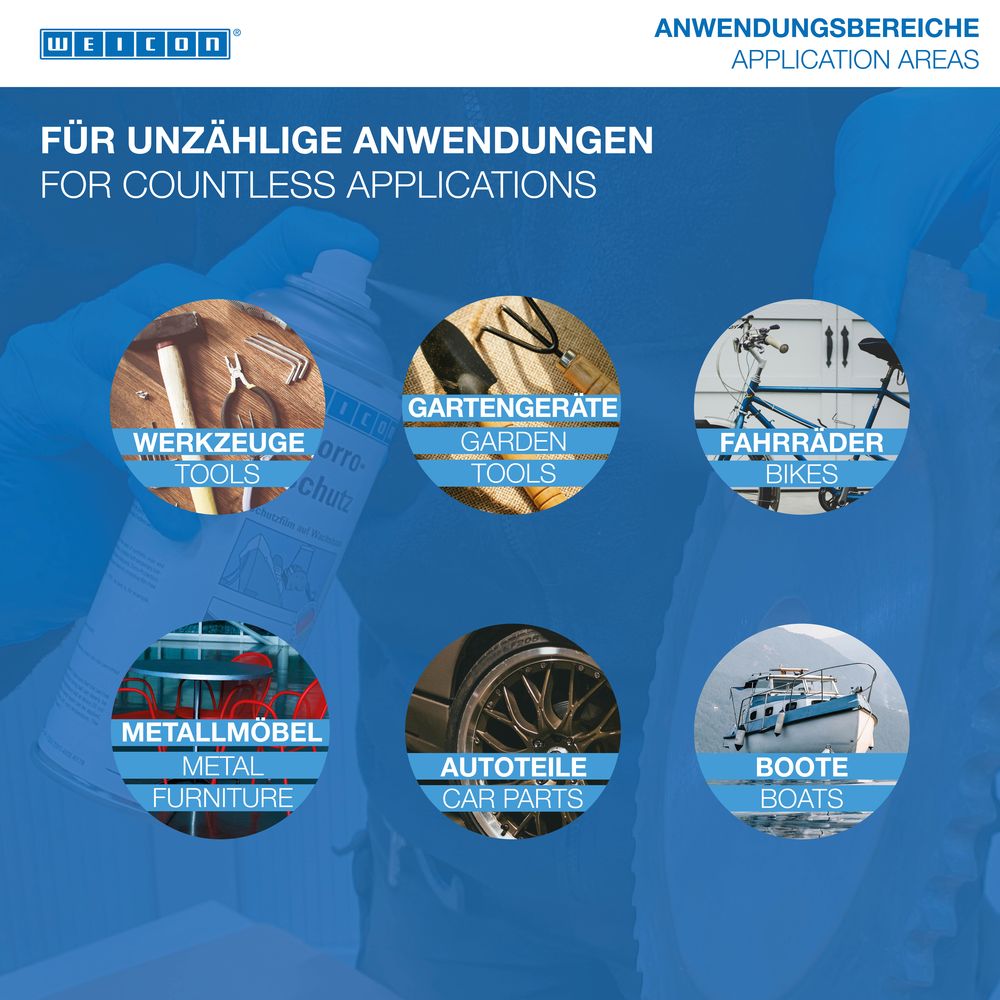 WEICON Protector de Corrosión es un producto anticorrosivo en base cera. Gracias a sus excelentes propiedades de deslizamiento, penetra incluso en los huecos más pequeños y forma una película protectora uniforme y no pegajosa. Para facilitar la inspección visual, el producto también está disponible en una versión de color magenta, que hace claramente visibles las superficies protegidas. La película elástica y de secado rápido desplaza la humedad de forma fiable y protege diversas superficies, como acero, aluminio o zinc, sin atacar los plásticos o el caucho. Por ello, es ideal para conservar maquinaria y piezas de precisión, ya sea para el almacenamiento a largo plazo en interiores, el almacenamiento a medio plazo en exteriores, la protección durante el transporte, o la conservación posterior de componentes de vehículos. Protege eficazmente componentes contra la corrosión y las influencias ambientales, durante el almacenamiento, el transporte y el funcionamiento continuo.