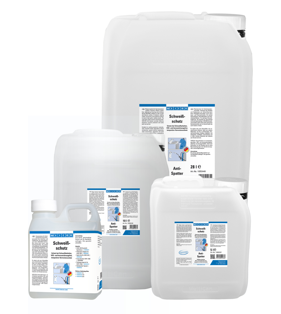WEICON Protector de la Soldadura es un desmoldeante para aplicaciones de soldadura a alta temperatura. Evita que las salpicaduras de soldadura se adhieran y quemen en las superficies durante la soldadura MIG/MAG, así como durante el corte por láser y plasma. Protege las boquillas de soldadura, los accesorios de soldadura y las superficies de las piezas de trabajo, garantizando excelentes resultados de soldadura. La calidad del cordón de soldadura no se ve afectada. WEICON Protector de la Soldadura también proporciona una eficaz protección temporal contra la corrosión y es efectivo tanto en seco como en húmedo. Es adecuado para soldar material austenítico, acero y otros metales diversos. El producto puede utilizarse en la construcción de vehículos, la ingeniería de maquinaria especial, la construcción de acero, la ingeniería de aparatos e instalaciones, la construcción naval, la fabricación de automóviles y muchos otros sectores industriales. WEICON Protector de la Soldadura es transparente, inodoro, libre de COV, no peligroso, sin silicona y sin disolventes. Tras la soldadura, el producto no interfiere en los procesos de galvanizado o pintura.
