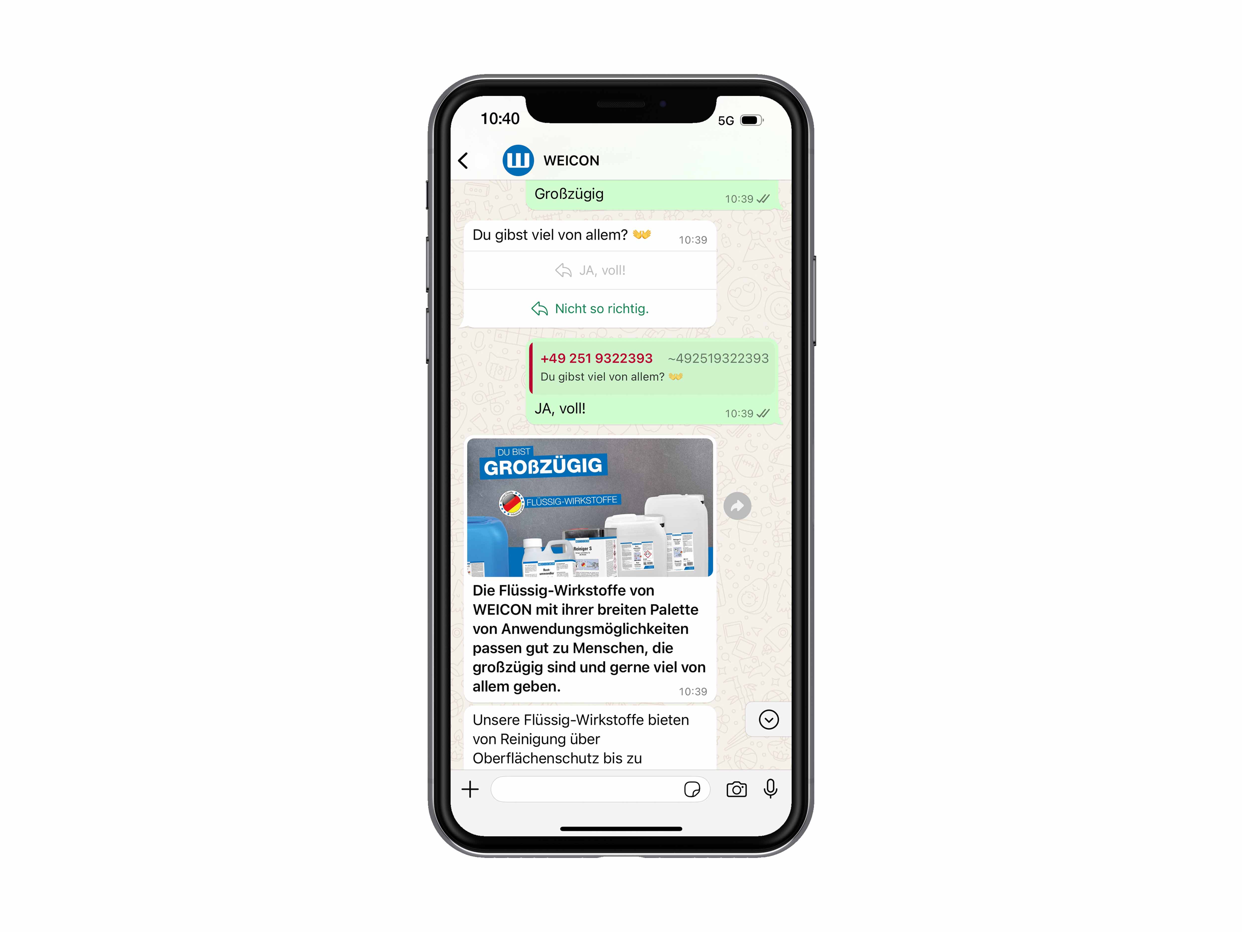 ¿Te interesan nuestros productos en general? ¿Pero no sabes, por ejemplo, si prefieres utilizar un aceite lubricante o una grasa lubricante, un adhesivo monocomponente o bicomponente, o aún te falta la herramienta adecuada? Entonces utiliza nuestro servicio de WhatsApp para recibir más información o haz nuestro test "¿Qué tipo de WEICON soy?" en WhatsApp.