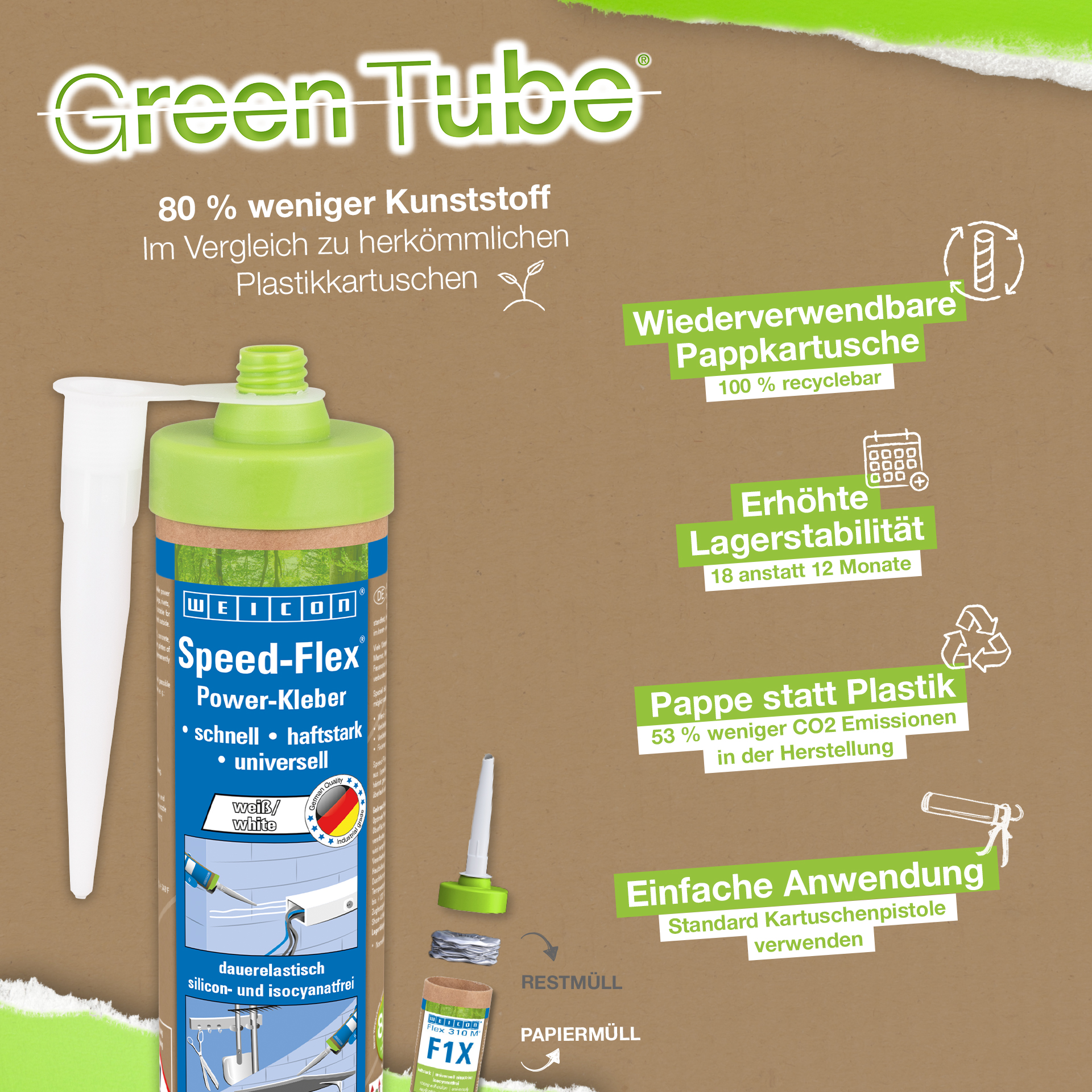 WEICON Speed-Flex es muy fuerte, pastoso, estable, pintable (húmedo sobre húmedo), resistente al envejecimiento, a la intemperie y a los rayos UV y libre de siliconas, isocianatos, halógenos y disolventes. WEICON Speed-Flex tiene certificado ISEGA y puede ser utilizado como adhesivo en la tecnología alimentaria. Es un adhesivo y sellador basado en polímero MS con una resistencia inicial extremadamente alta y es adecuado para la unión de metales, muchos plásticos, cerámica, madera, vidrio y piedra. Speed-Flex sustituye a las fijaciones tradicionales como tornillos, espigas, remaches, etc. Su gran resistencia inicial permite pegar incluso superficies verticales en interiores y exteriores. El producto puede utilizarse en trabajos en seco e interiores, construcción metálica, ingeniería de depósitos y aparatos, en sistemas de ventilación y aire acondicionado, en construcción de exposiciones y equipamiento de tiendas y en todas las aplicaciones en las que las siliconas o los productos que las contienen no son adecuados.