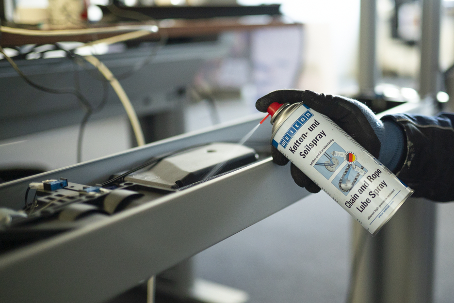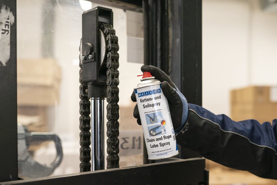 El Spray Cadenas y Cables de WEICON es un lubricante adherente sintético transparente para la lubricación permanente en el interior y exterior de cadenas y cables de todo tipo para el servicio pesado. El Spray Cadenas y Cables es especialmente adherente y resistente a la presión, de extrema fluidez, isonorizante así como repelente al agua y evita el alargamiento, la fricción y el desgaste. El Spray Cadenas y Cables WEICON puede aplicarse en cadenas y cables de todo tipo, ruedas dentadas y engranajes helicoidales, en piezas de máquinas de gran velocidad, articulaciones y acoples, rodillos y cojinetes de bolas y en paquetes de resortes y en una gran cantidad de otros campos industriales.