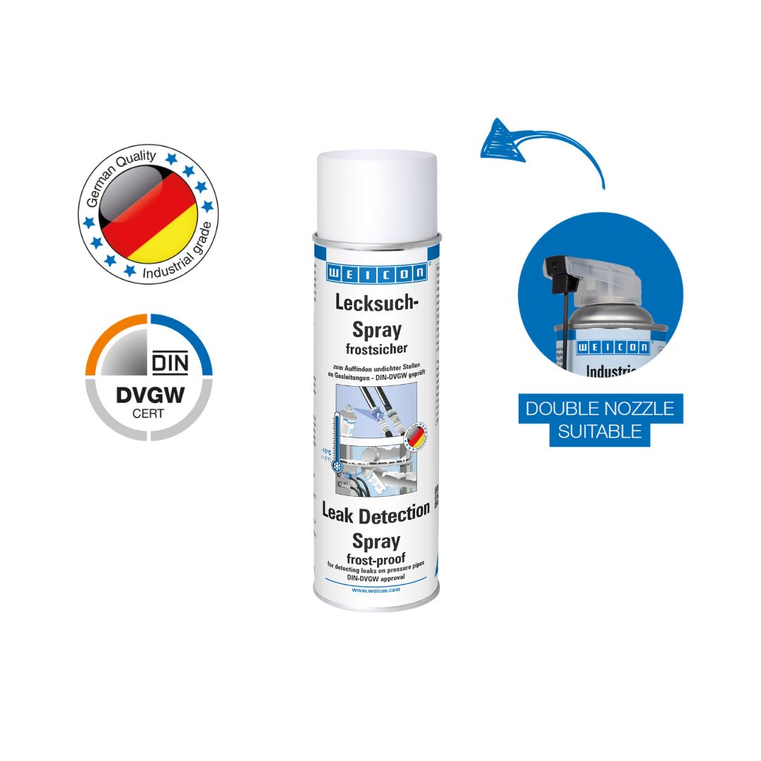 Para la búsqueda fiable, fácil y rápida de fugas o lugares porosos en conductos de gas. El Detector de Fugas «a prueba de heladas» es compatible, sin riesgos, con gases tales como dióxido de carbono (CO2), propano, butano, acetileno, oxígeno, gas de ciudad y gas natural, nitrógeno, óxido nitroso (N2O) y hidrofluorocarbono. Este spray no es inflamable. El Detector de Fugas «a prueba de heladas» puede ser utilizado en todo proceso en el que se opera con aire comprimido o sustancias gaseosas. El spray puede ser aplicado por ejemplo en tuberías, mangueras, conexiones atornilladas y soldadas, griferías, válvulas, conectores y adaptadores.