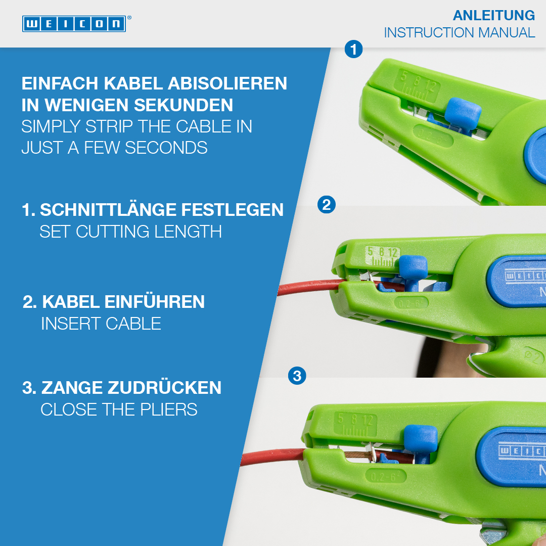• pelacables automático para todos los conductores trenzados y rígidos habituales (0,2 - 6. 0 mm²) • muy fácil de manejar • cortador lateral integrado y bien accesible de hasta 2 mm Ø • trabajo preciso gracias al tope de longitud ajustable (5 - 12 mm) • ahorro de espacio gracias al bloqueo del pelacables • su bajo peso garantiza un trabajo sin fatiga • cuchillas reemplazables • 100% fabricado en Alemania • fabricado en biopolímero reforzado con fibra de vidrio como la poliamida • forma robusta y ergonómica, agarre seguro • cuchillas de acero de alta calidad de Solingen y, por lo tanto, cuchillas duraderas • comprobado por TÜV/ GS para la seguridad en el trabajo Pelacables automático para pelar todos los conductores trenzados y rígidos comunes de 0. 2 a 6,0 mm². El pelacables dispone de un sistema de escaneo que se ajusta automáticamente al diámetro del cable correspondiente, lo que permite desmontarlo y pelarlo de forma rápida y sencilla y evita dañar los conductores interiores. La herramienta es fácil de manejar con mecanismos de funcionamiento suave. El tope de longitud ajustable (5 - 12 mm) permite cortar los cables a medida. En caso necesario, también se puede retirar el tope longitudinal. La herramienta lleva integrada una cuchilla lateral de fácil acceso. Corta cables de hasta 2 mm de diámetro. Gracias al mecanismo de bloqueo, el pelacables se puede guardar de forma fácil y segura. El bajo peso de la herramienta garantiza un trabajo sin fatiga.