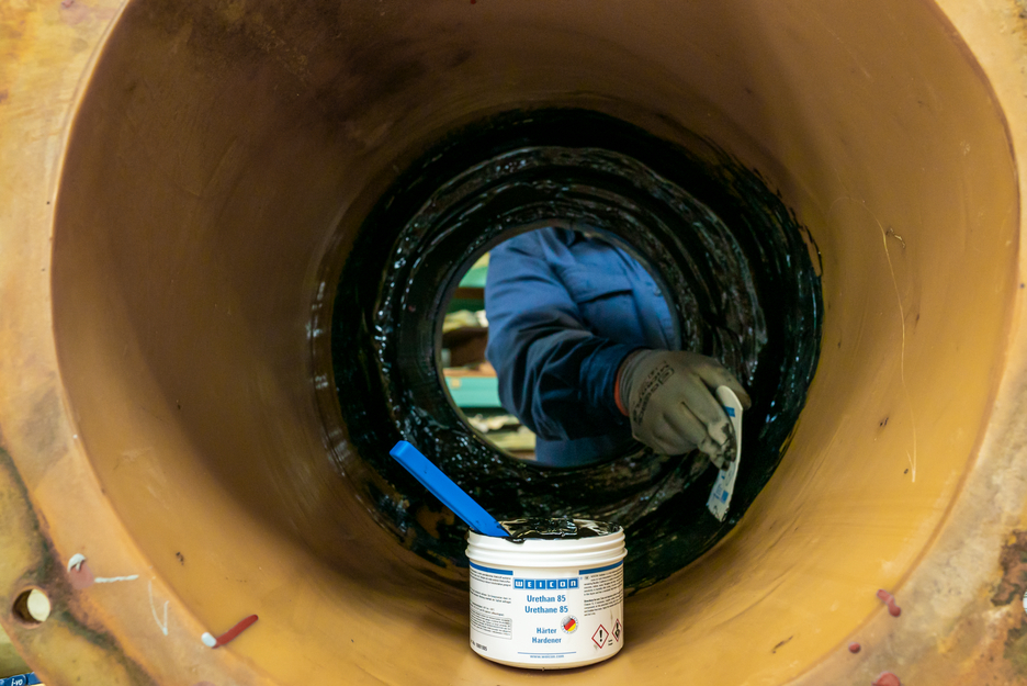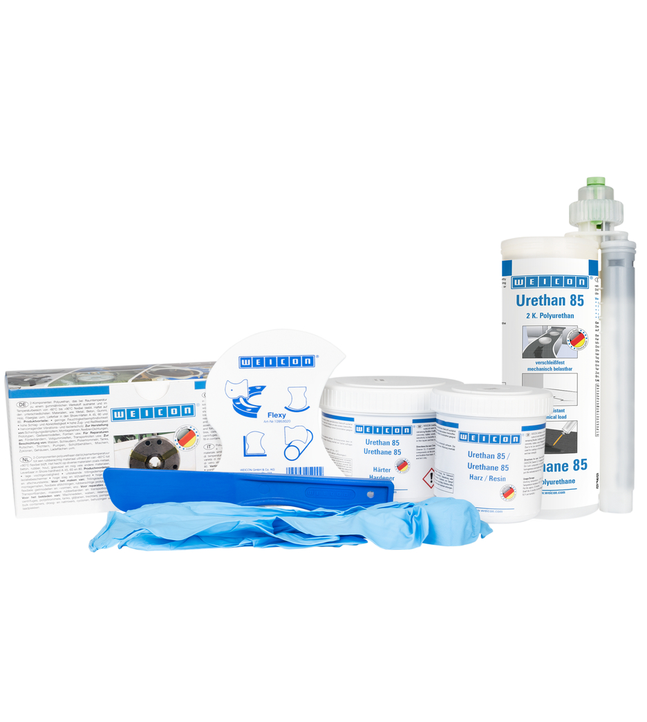 WEICON Uretano 85 es una masilla de poliuretano de dos componentes con excelente resistencia mecánica para la rápida reparación, retoque y recubrimiento de piezas de caucho y metal, expuestas a golpes, abrasión, vibración o movimiento. Presenta una gran elasticidad y resistencia al desgaste. El Uretano 85 es adecuado para muchas aplicaciones, como la reparación de componentes de caucho y cintas transportadoras, la reparación y el retoque de revestimientos de caucho, como protección flexible contra el desgaste para carcasas de bombas e impulsores, así como para la reparación rápida de juntas y rodillos de caucho desgastados.