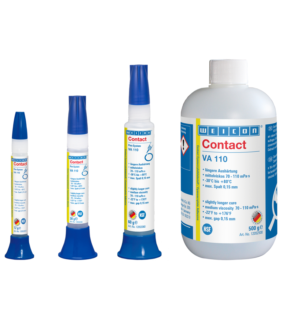Weicon VA 110 es un adhesivo de cianoacrilato con aprobación NSF que puede utilizarse en áreas sensibles como en el sector alimentario y de agua potable, en la industria farmacéutica o en la fabricación de juguetes.