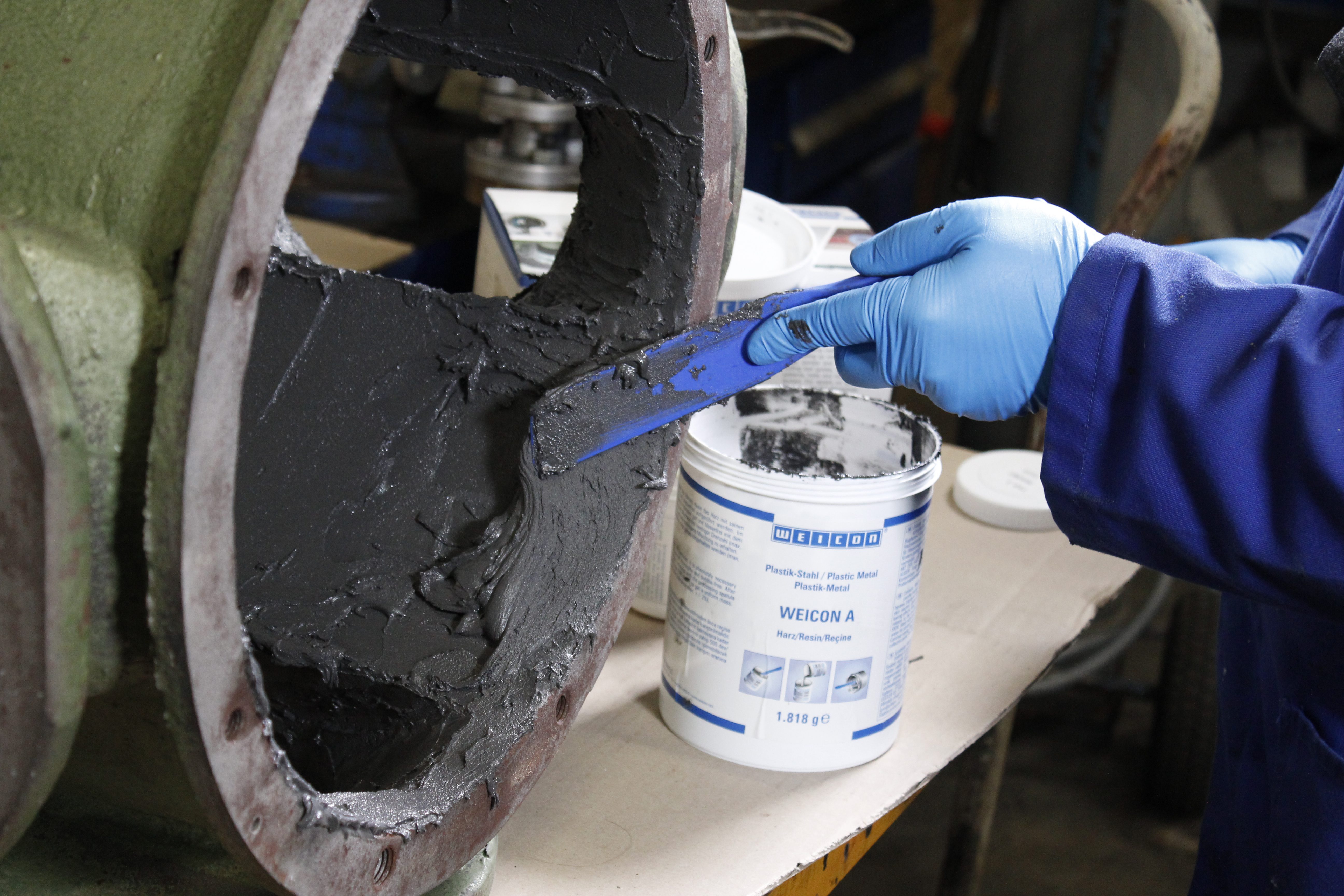 WEICON A cuenta con un certificado DNV y es adecuado especialmente para trabajos de reparación en el sector marítimo. El sistema de resina epoxi está rellenado de pigmentos de acero, es magnético y tan pastoso que puede aplicarse incluso en superficies verticales. Puede utilizarse para eliminar daños por corrosión y picaduras o para reparar agujeros y soplos. Por ejemplo, puede utilizarse para reproducir componentes de acero pesados que presentan daños graves debidos a la corrosión y perforaciones. En este contexto, WEICON A es una alternativa real a la soldadura por acumulación, ya que no hay distorsión por calor durante el procesamiento de la resina epoxi, como ocurre durante la soldadura. El sistema de 2 componentes puede utilizarse para reparar depósitos y tuberías, así como para reparar grietas en carcasas de motores o bombas y piezas de máquinas. Es ideal para su uso en sistemas de alcantarillado en los que las tuberías y conductos están expuestos a fuertes influencias del medio. Otras aplicaciones se encuentran en la construcción de máquinas, herramientas, modelos y dispositivos de sujeción. WEICON A puede utilizarse en ingeniería mecánica, en la fabricación de herramientas, en la industria del cemento, en centrales eléctricas, en la fabricación de modelos y moldes, así como en muchas otras áreas industriales.