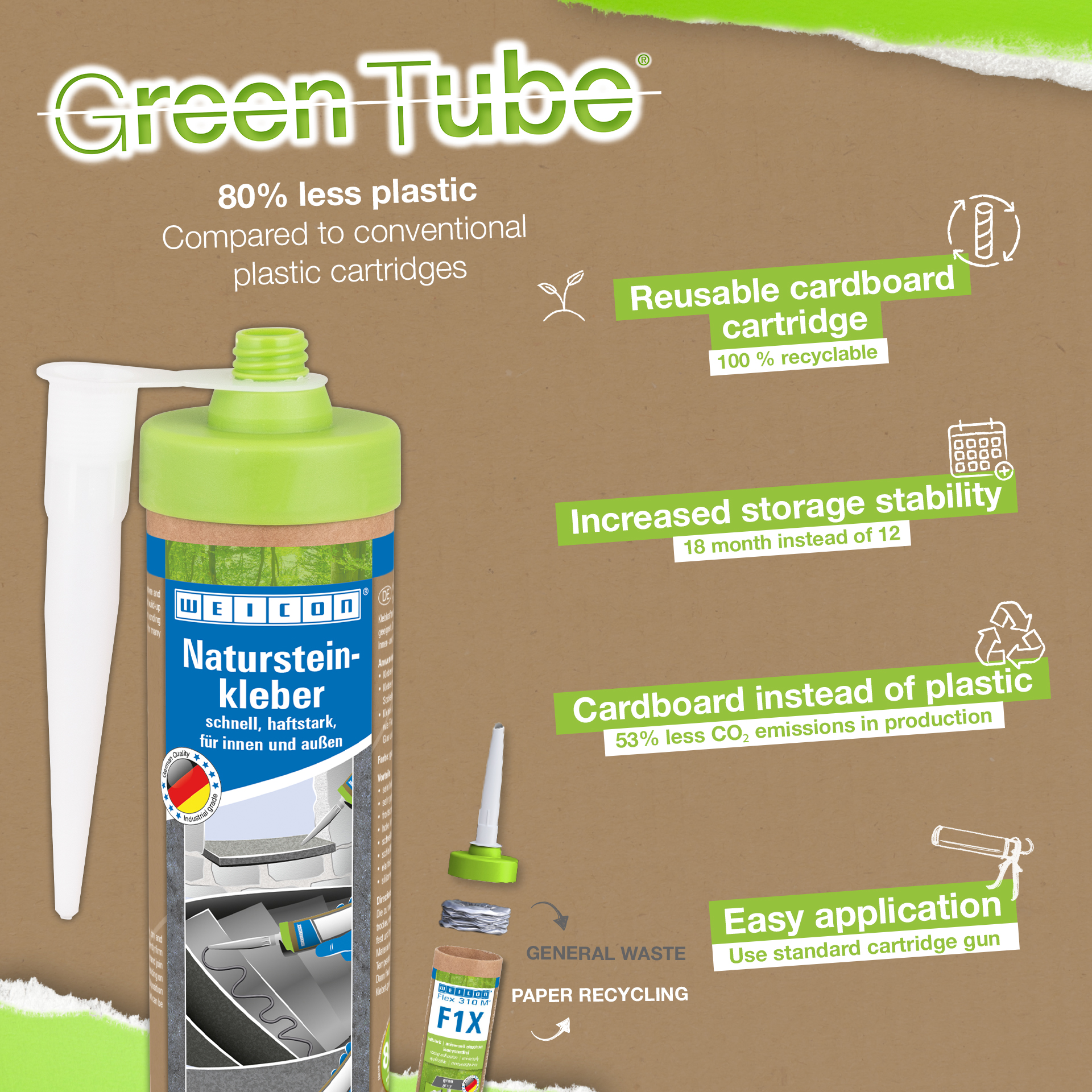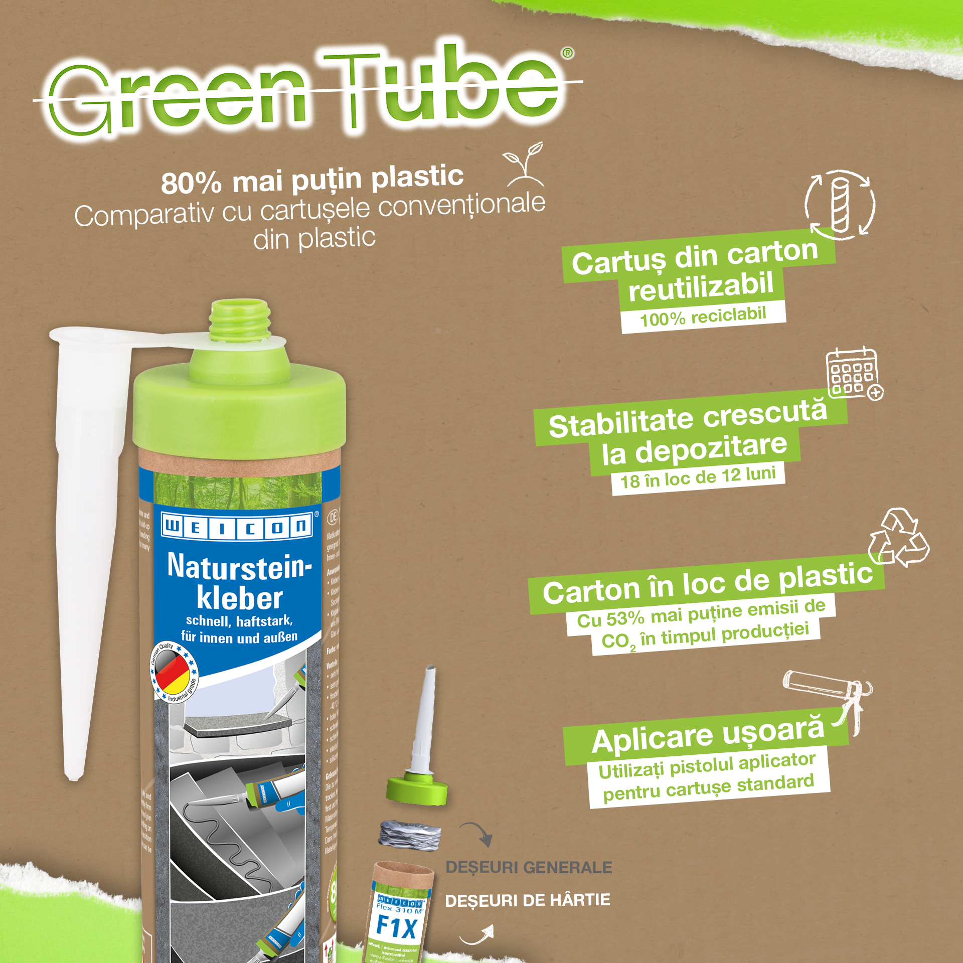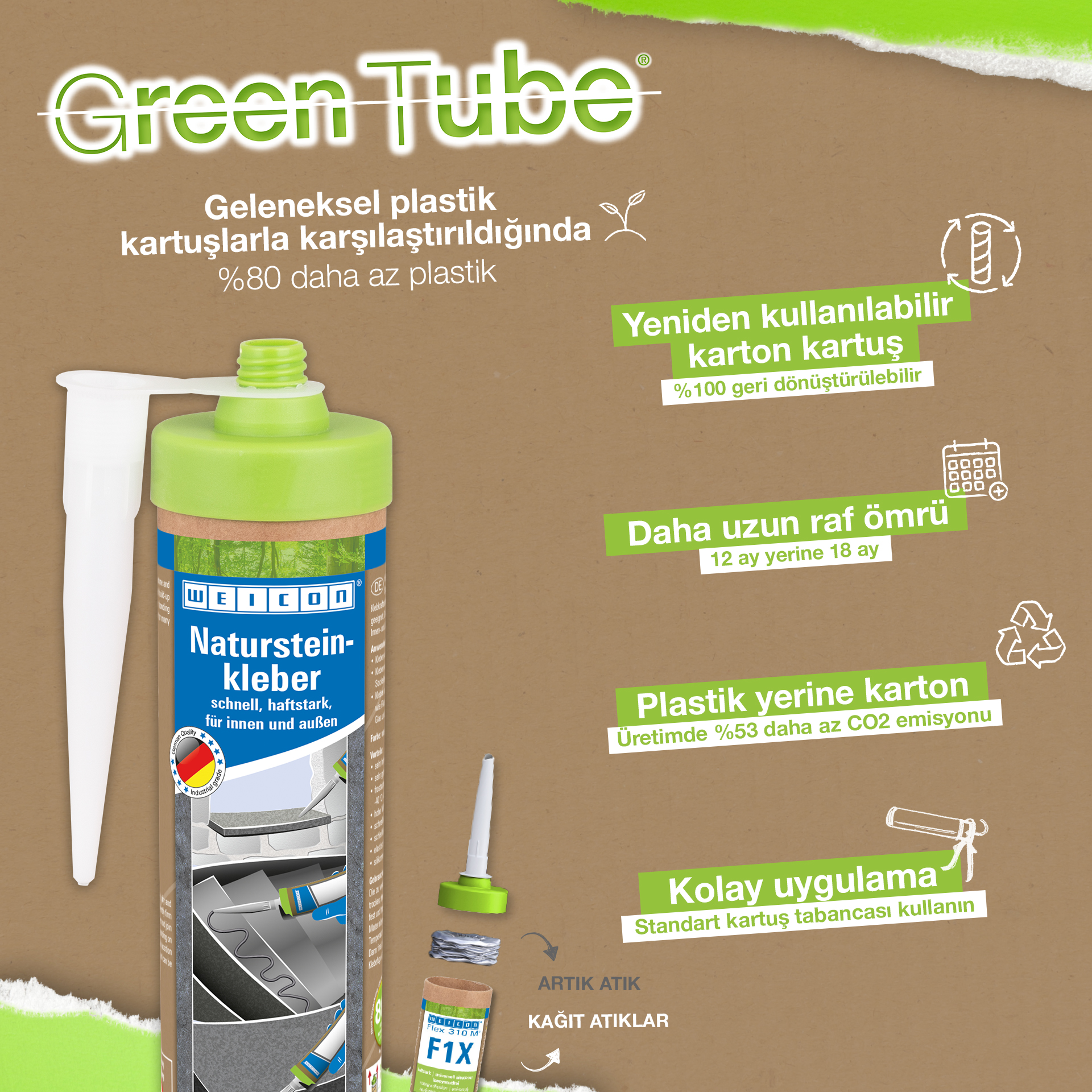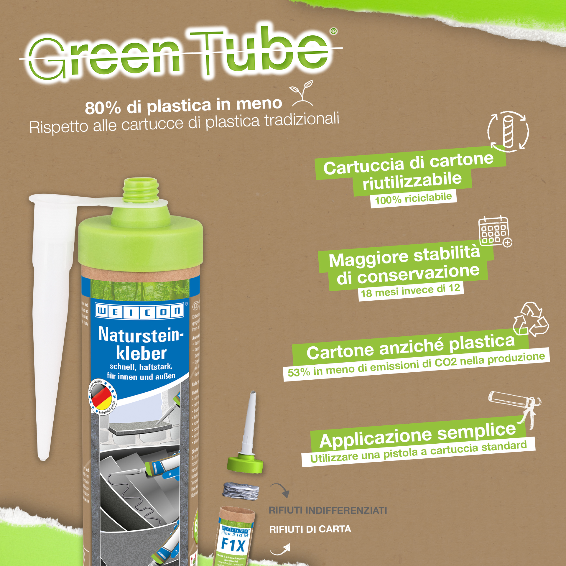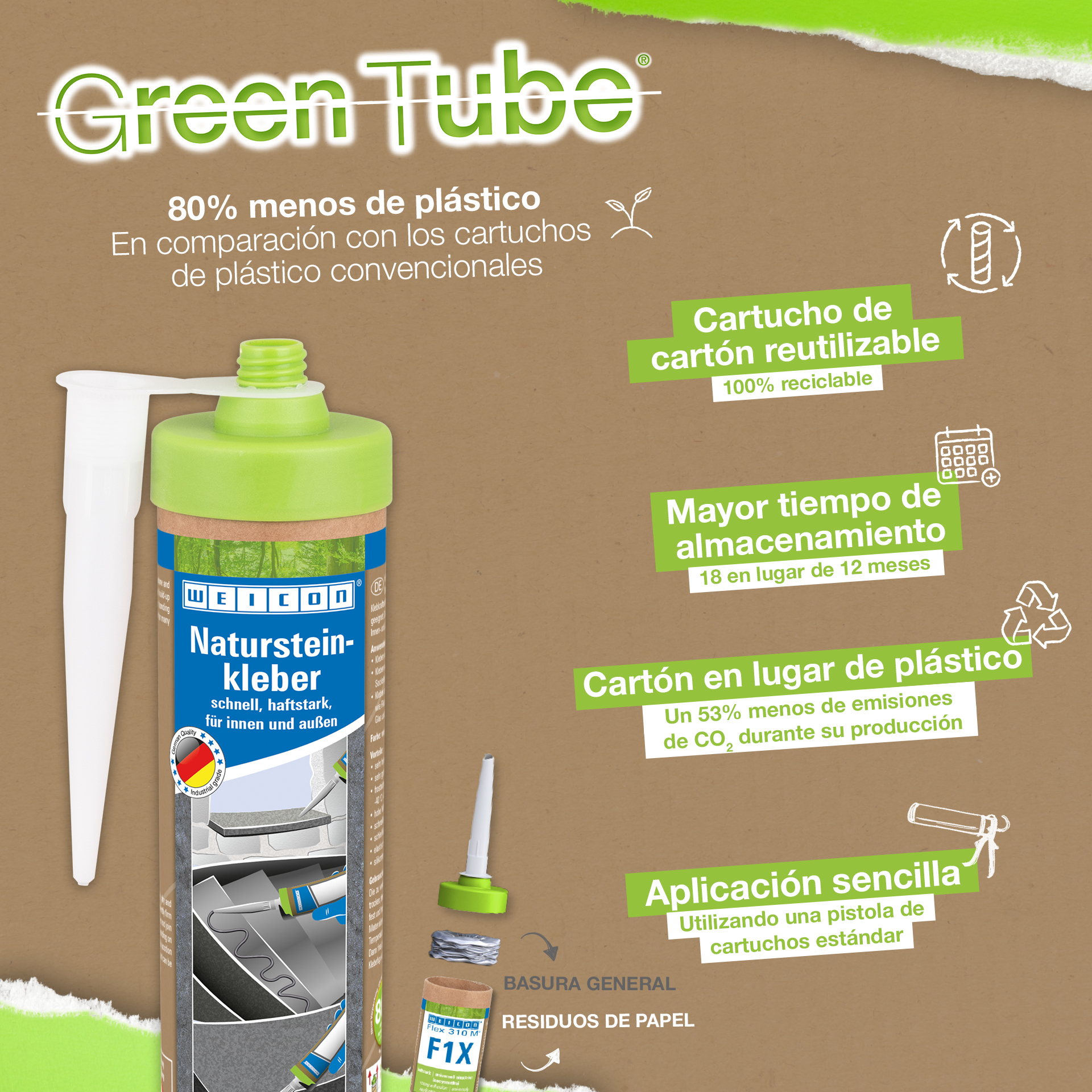 WEICON Adhesivo para Piedra Natural es un fuerte adhesivo para la fijación de piedra natural, roca y cerámica. Gracias a su gran adherencia inicial y a la rápida acumulación de fuerza adhesiva, el pegado es posible incluso en superficies verticales como paredes. Este adhesivo es adecuado para muchas aplicaciones en interiores y exteriores. Es resistente a las heladas y a altas temperaturas, de -40°C a +90°C, así como a la intemperie y a los rayos UV. El Adhesivo para Piedra Natural se endurece rápidamente y tiene una resistencia final muy alta. Tras el curado, el adhesivo puede lijarse y sigue siendo elástico para compensar las vibraciones. El adhesivo no contiene siliconas, isocianatos, halógenos ni disolventes. Puede utilizarse en una gran variedad de aplicaciones, por ejemplo, para pegar alféizares de ventanas, azulejos, rodapiés, molduras decorativas o peldaños de escaleras. WEICON Adhesivo para Piedra Natural se adhiere muy bien a una gran variedad de materiales, como madera, materiales derivados de la madera, plásticos, metales, vidrio y sustratos minerales. Está disponible en gris y blanco.