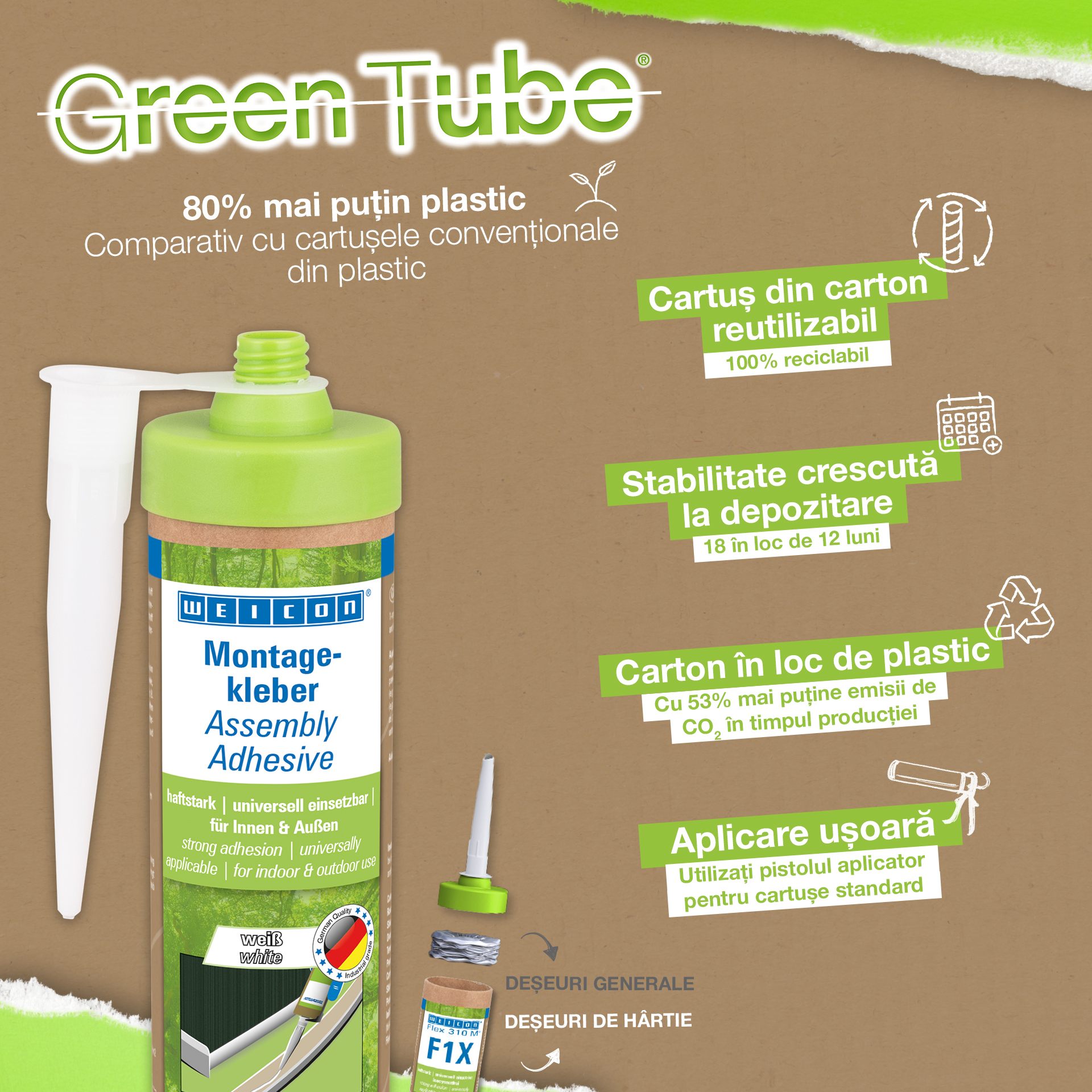 WEICON Green Tube Adhesivo de Montaje es un adhesivo acrílico de dispersión fuerte para trabajos de montaje, reparación y retoque. El adhesivo tiene una alta adhesión inicial y resistencia final, y cura rápidamente. Una vez curado, el adhesivo de montaje puede lijarse y servir de recubrimiento, además pintarse con pinturas y barnices convencionales. El adhesivo es resistente a la temperatura en un rango de -20°C a +80°C y es adecuado para aplicaciones tanto en interiores como en exteriores. Es un adhesivo flexible, de color blanco, bajo en emisiones y no contiene disolventes. WEICON Green Tube Adhesivo de Montaje es de aplicación universal y puede utilizarse para una gran variedad de necesidades. Es ideal, por ejemplo, para el pegado superficial de materiales derivados de la madera (como rodapiés, molduras decorativas, paneles o tableros aglomerados), PVC, poliestireno, placas de espuma de poliestireno, espuma rígida de PU (por ejemplo, placas aislantes y conductos de cables), materiales minerales (por ejemplo, baldosas) y metales sobre sustratos absorbentes como yeso, hormigón, fibrocemento, placas de yeso y madera sin tratar. Envase ecológico: ¡el mismo rendimiento! Green Tube, el envase sostenible: la punta y la tapa están fabricadas con plástico 100% reciclado, y el cuerpo del cartucho es totalmente de cartón. Esto se refleja en menos emisiones de CO₂ y en un menor uso de plástico en comparación con los cartuchos convencionales, ¡todo ello sin afectar a la calidad!