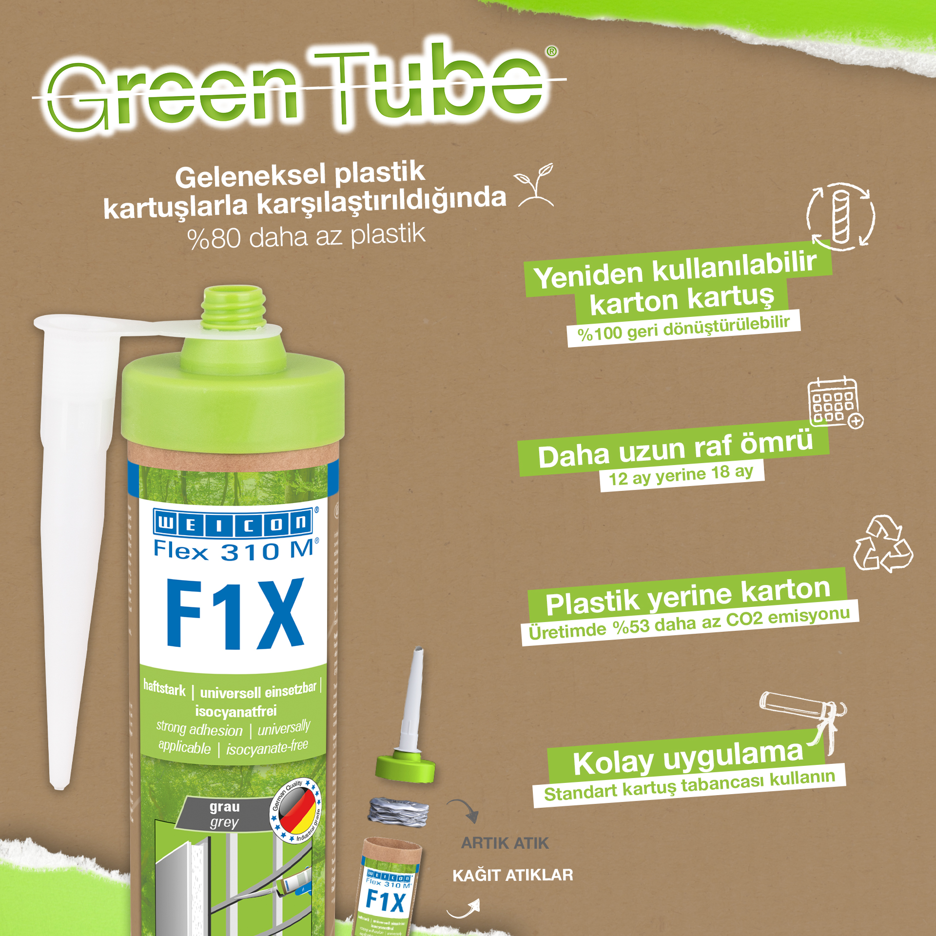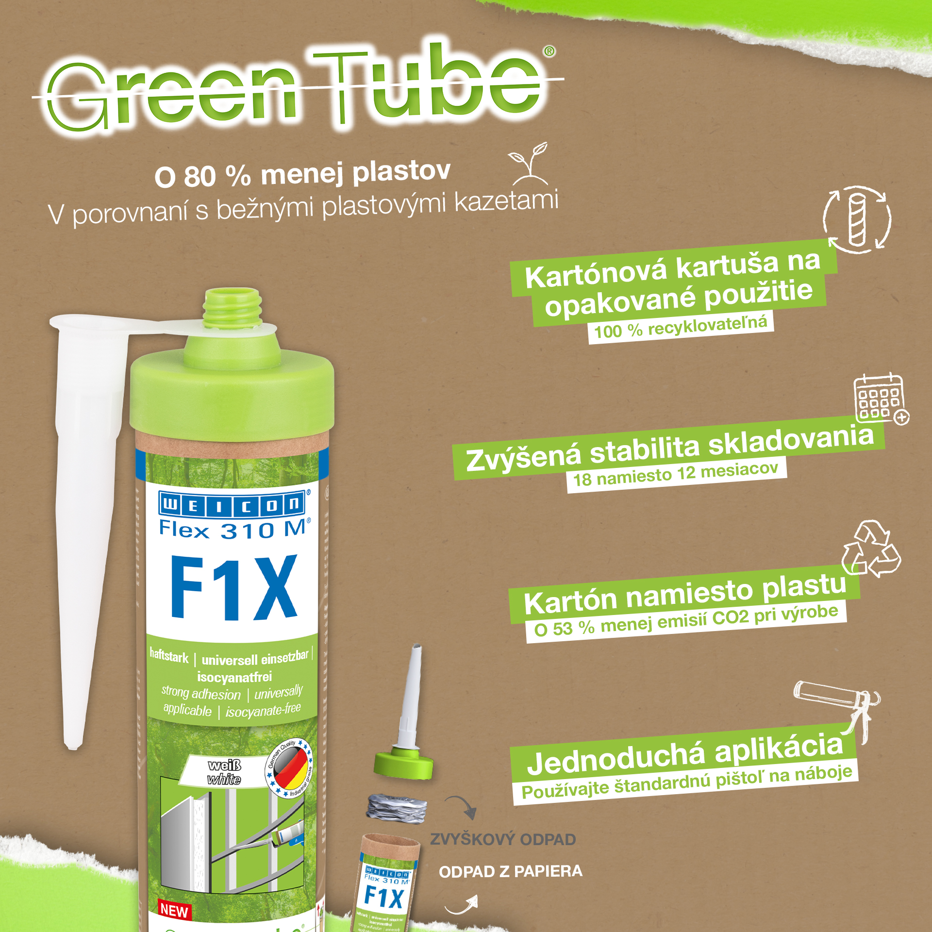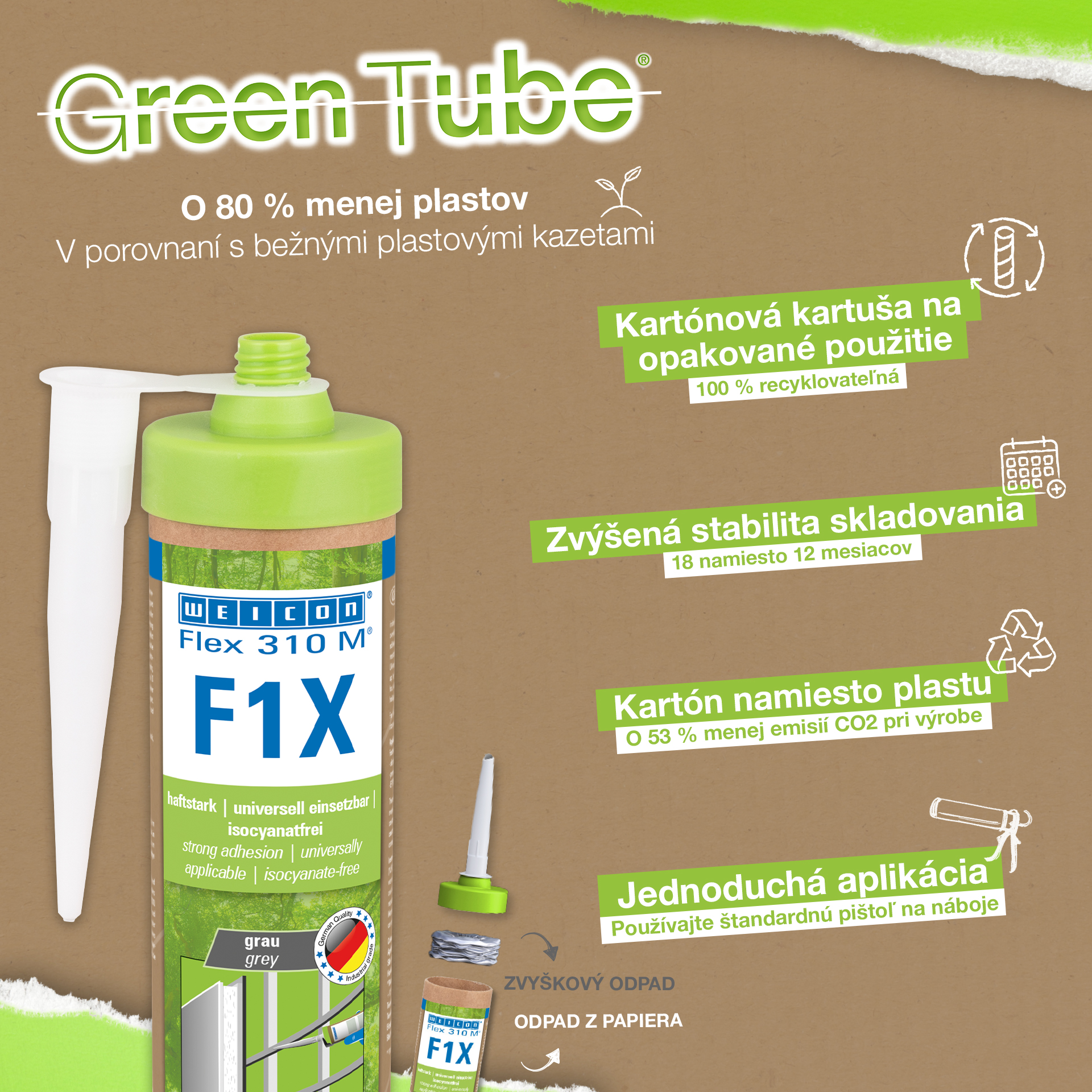 WEICON Flex 310 M F1X es un adhesivo y sellador elástico basado en polímero MS. El adhesivo es de color gris, muy fuerte y universalmente adecuado para fijar de forma permanente casi todos los materiales a una gran variedad de superficies. Gracias a su gran adherencia inicial, se puede pegar en superficies verticales e incluso por encima de la cabeza, tanto en interiores como en exteriores. Por ejemplo, Flex 310 M F1X puede utilizarse para unir entre sí metales, muchos plásticos, cerámica, madera, vidrio y piedra. El adhesivo permanentemente elástico puede pintarse "húmedo sobre húmedo", es lijable, resistente a la intemperie, a la humedad, al envejecimiento, al moho y a los rayos UV. Resiste brevemente (hasta 30 minutos) temperaturas de hasta 180°C y puede recubrirse con pintura en polvo tras un tiempo de curado de cuatro días. El adhesivo y sellador no contiene silicona, isocianatos, halógenos ni disolventes, y no es corrosivo. Flex 310 M F1X se puede utilizar para fijar rodapiés, paneles acústicos, listones, marcos, paneles, tableros, azulejos, piedras y láminas de EPDM. Se puede utilizar en la construcción en seco y de interiores, en la construcción metálica, en la construcción de depósitos y aparatos, en la construcción de contenedores, en la técnica de ventilación y climatización, en la construcción de ferias y tiendas, en la construcción de yates y embarcaciones y en todos los lugares en los que las siliconas o los productos que contienen silicona no son adecuados. Envase ecológico: ¡el mismo rendimiento! Green Tube, el envase sostenible: la punta y la tapa están fabricadas con plástico 100% reciclado, y el cuerpo del cartucho es totalmente de cartón. Esto se refleja en menos emisiones de CO₂ y en un menor uso de plástico en comparación con los cartuchos convencionales, ¡todo ello sin afectar a la calidad!
