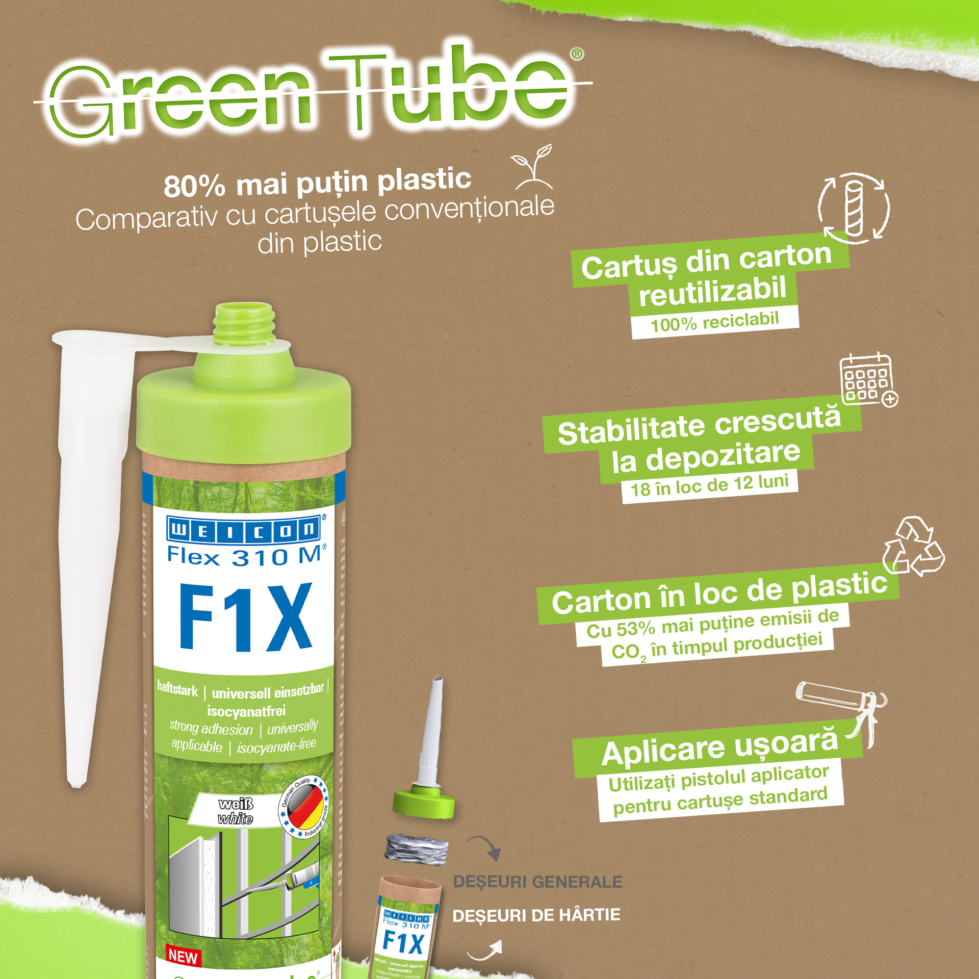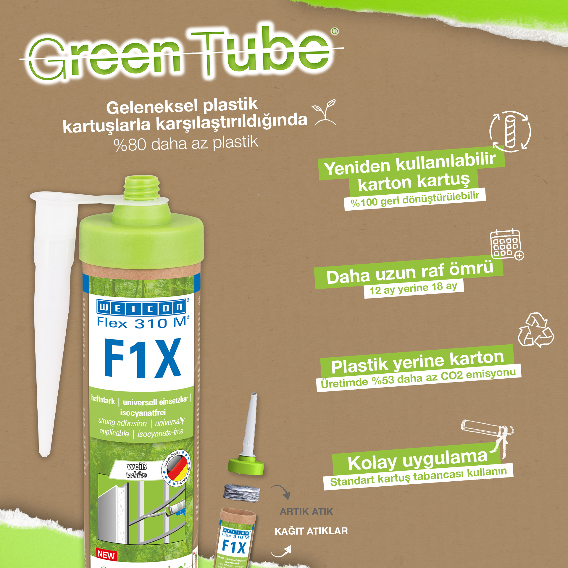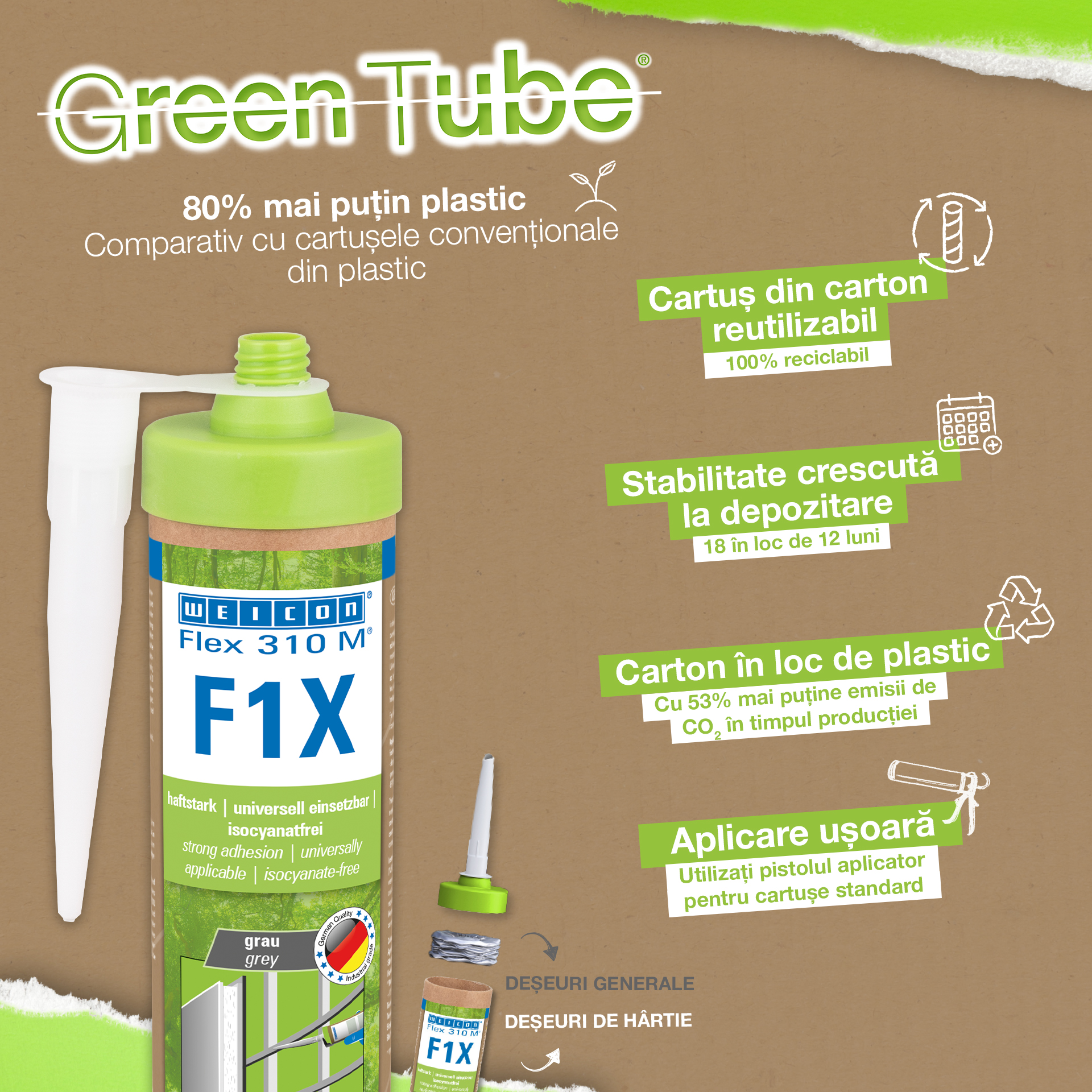 WEICON Flex 310 M F1X es un adhesivo y sellador elástico basado en polímero MS. El adhesivo es de color gris, muy fuerte y universalmente adecuado para fijar de forma permanente casi todos los materiales a una gran variedad de superficies. Gracias a su gran adherencia inicial, se puede pegar en superficies verticales e incluso por encima de la cabeza, tanto en interiores como en exteriores. Por ejemplo, Flex 310 M F1X puede utilizarse para unir entre sí metales, muchos plásticos, cerámica, madera, vidrio y piedra. El adhesivo permanentemente elástico puede pintarse "húmedo sobre húmedo", es lijable, resistente a la intemperie, a la humedad, al envejecimiento, al moho y a los rayos UV. Resiste brevemente (hasta 30 minutos) temperaturas de hasta 180°C y puede recubrirse con pintura en polvo tras un tiempo de curado de cuatro días. El adhesivo y sellador no contiene silicona, isocianatos, halógenos ni disolventes, y no es corrosivo. Flex 310 M F1X se puede utilizar para fijar rodapiés, paneles acústicos, listones, marcos, paneles, tableros, azulejos, piedras y láminas de EPDM. Se puede utilizar en la construcción en seco y de interiores, en la construcción metálica, en la construcción de depósitos y aparatos, en la construcción de contenedores, en la técnica de ventilación y climatización, en la construcción de ferias y tiendas, en la construcción de yates y embarcaciones y en todos los lugares en los que las siliconas o los productos que contienen silicona no son adecuados. Envase ecológico: ¡el mismo rendimiento! Green Tube, el envase sostenible: la punta y la tapa están fabricadas con plástico 100% reciclado, y el cuerpo del cartucho es totalmente de cartón. Esto se refleja en menos emisiones de CO₂ y en un menor uso de plástico en comparación con los cartuchos convencionales, ¡todo ello sin afectar a la calidad!