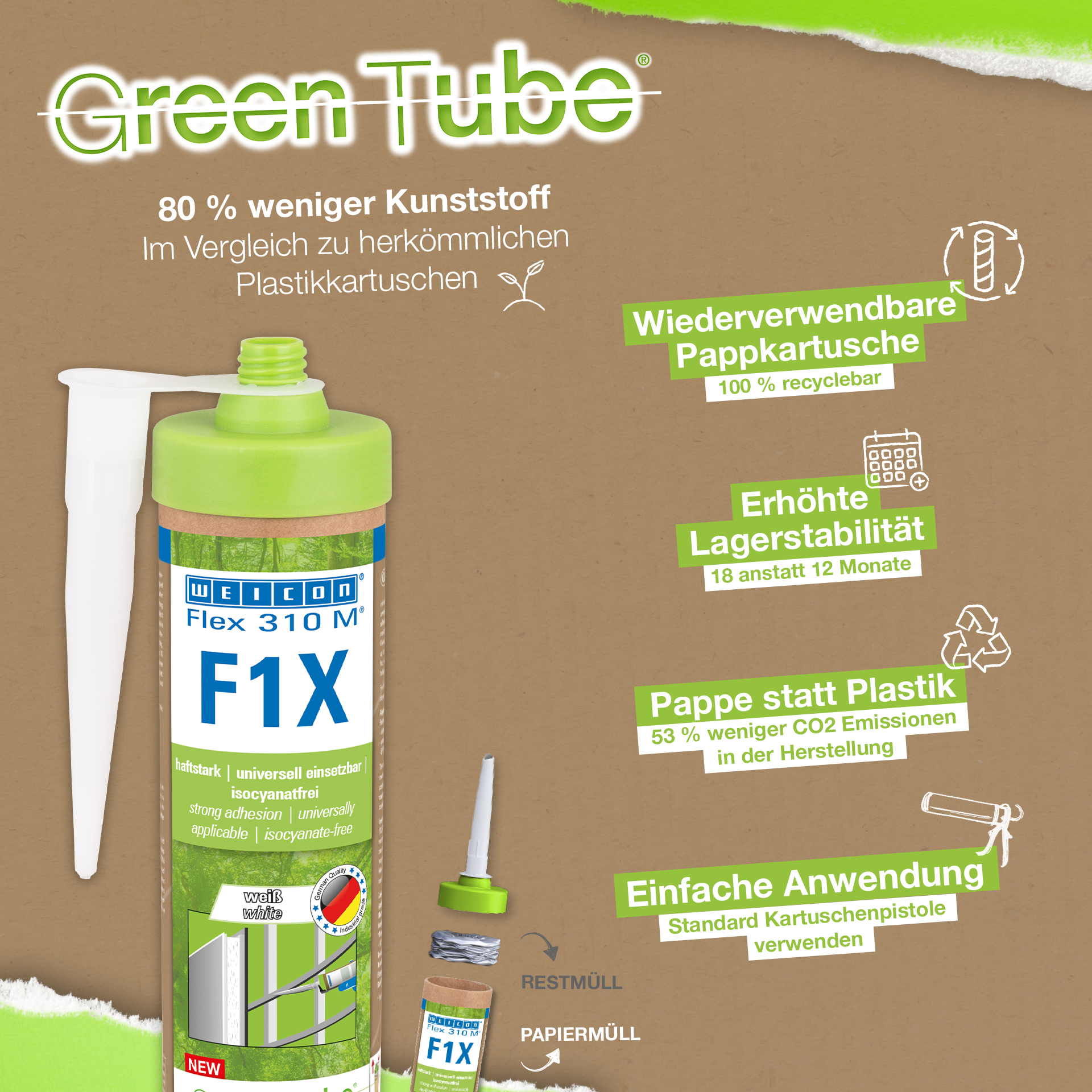 WEICON Flex 310 M F1X es un adhesivo y sellador elástico basado en polímero MS. El adhesivo es de color gris, muy fuerte y universalmente adecuado para fijar de forma permanente casi todos los materiales a una gran variedad de superficies. Gracias a su gran adherencia inicial, se puede pegar en superficies verticales e incluso por encima de la cabeza, tanto en interiores como en exteriores. Por ejemplo, Flex 310 M F1X puede utilizarse para unir entre sí metales, muchos plásticos, cerámica, madera, vidrio y piedra. El adhesivo permanentemente elástico puede pintarse "húmedo sobre húmedo", es lijable, resistente a la intemperie, a la humedad, al envejecimiento, al moho y a los rayos UV. Resiste brevemente (hasta 30 minutos) temperaturas de hasta 180°C y puede recubrirse con pintura en polvo tras un tiempo de curado de cuatro días. El adhesivo y sellador no contiene silicona, isocianatos, halógenos ni disolventes, y no es corrosivo. Flex 310 M F1X se puede utilizar para fijar rodapiés, paneles acústicos, listones, marcos, paneles, tableros, azulejos, piedras y láminas de EPDM. Se puede utilizar en la construcción en seco y de interiores, en la construcción metálica, en la construcción de depósitos y aparatos, en la construcción de contenedores, en la técnica de ventilación y climatización, en la construcción de ferias y tiendas, en la construcción de yates y embarcaciones y en todos los lugares en los que las siliconas o los productos que contienen silicona no son adecuados. Envase ecológico: ¡el mismo rendimiento! Green Tube, el envase sostenible: la punta y la tapa están fabricadas con plástico 100% reciclado, y el cuerpo del cartucho es totalmente de cartón. Esto se refleja en menos emisiones de CO₂ y en un menor uso de plástico en comparación con los cartuchos convencionales, ¡todo ello sin afectar a la calidad!