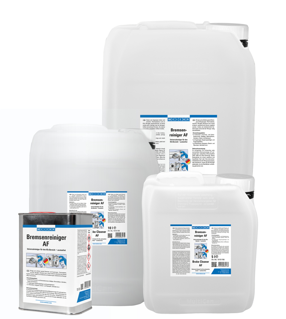 WEICON Limpiador de Frenos AF es un limpiador universal sin acetona para el sector de la automoción. El agente líquido limpia, desengrasa y se evapora completamente sin dejar residuos. El Limpiador de Frenos AF desengrasa y limpia rápidamente y sin esfuerzo metales, vidrio, materiales de goma, superficies con recubrimiento de polvo y muchos plásticos, y elimina de forma fiable la suciedad y los residuos de aceite y grasa. El limpiador puede utilizarse en frenos (frenos de tambor y de disco, forros, pastillas de freno, cilindros, muelles y casquillos), embragues (forros y piezas de embrague) o piezas del motor (carburadores, bombas de gasolina y aceite, cajas de cambios, etc.). Además, es adecuado para limpiar perfiles de plástico, juntas o superficies pintadas y puede utilizarse en muchos ámbitos de la industria y el comercio.